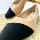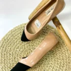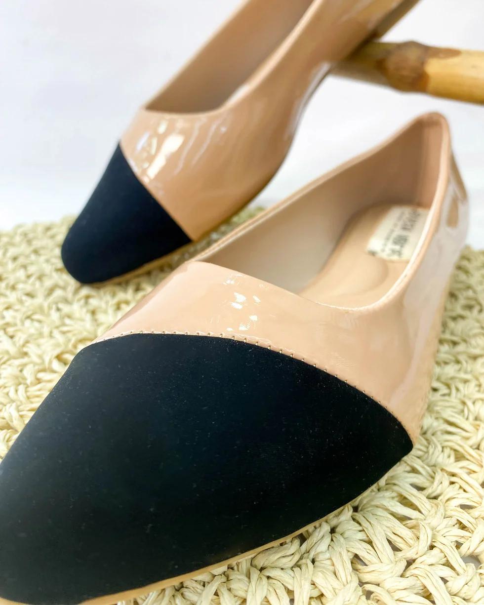 Baletas en charol nude con punta negra, elegantes, cómodas y fáciles de combinar.