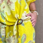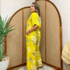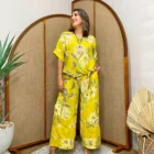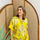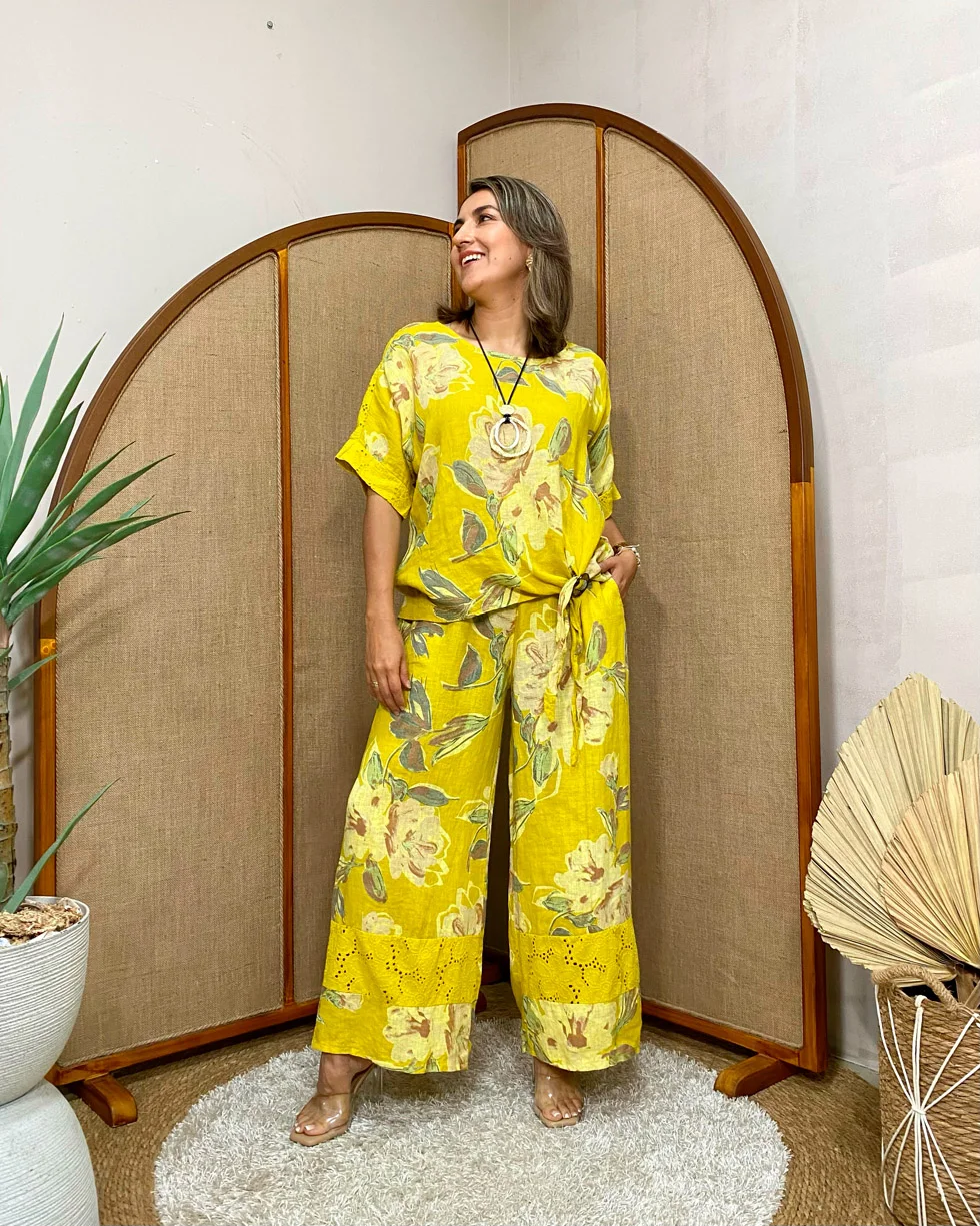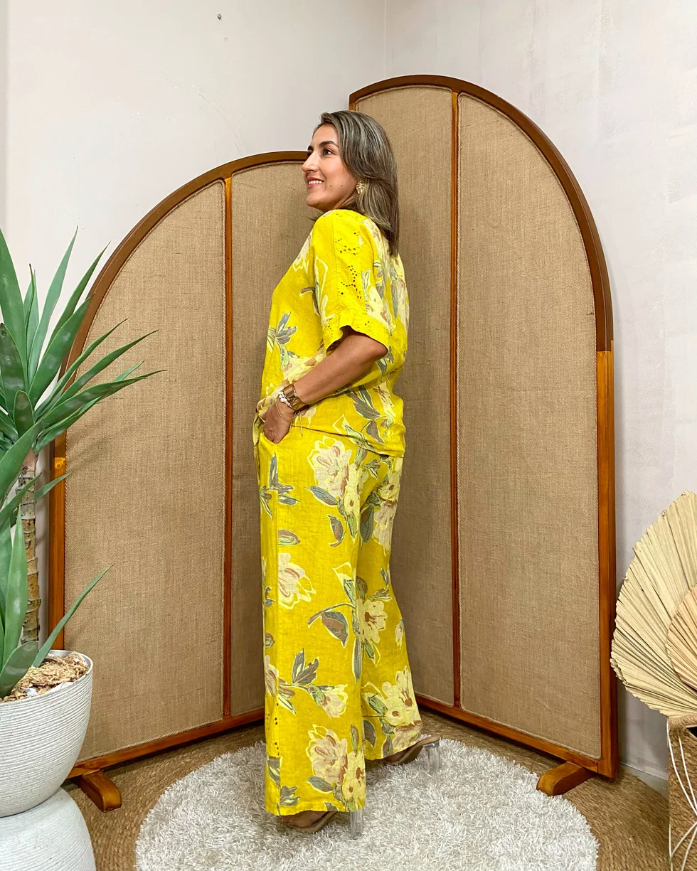 Blusa 100% lino estampado floral - Única, Amarillo mostaza+Collar Doble Aro Metálico+Palazzo de mujer - Única
