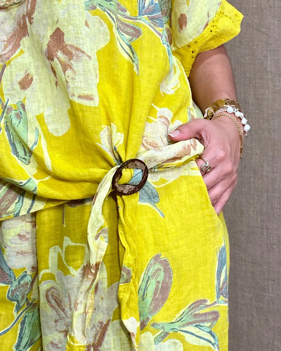 Esta es una blusa amarilla con estampado floral que tiene una manga corta con delicados detalles en el borde además de un detalle de amarre en frente. Su material de confección es lino 100%, una tela ligera y súper fresca. Su corte suelto y relajado nos brinda una libertad de movimiento, mientras que su estampado floral le añade un aire sofisticado.