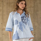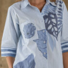 Blusa a rayas manga 3/4 con botones en frente y estampado de hojas.