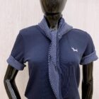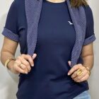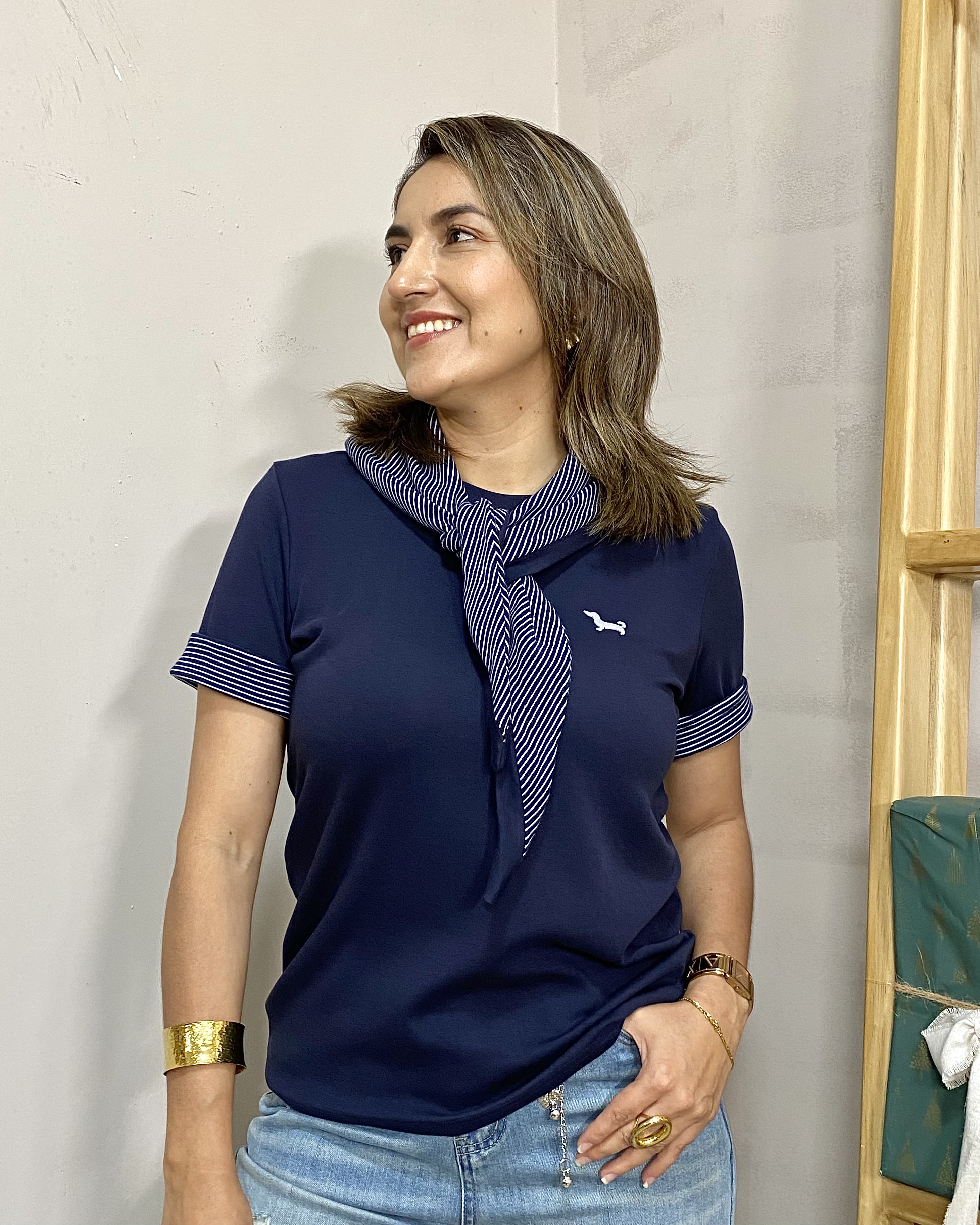 Esta es una prenda de estilo casual, en la que destaca su contraste de color en las mangas, además presenta un corte clásico que realza la silueta. Incluye un pañuelo en el mismo tono de las mangas que le da un toque distintivo al look. El tejido de su elaboración es suave y ligero, lo que nos ofrece comodidad y frescura.