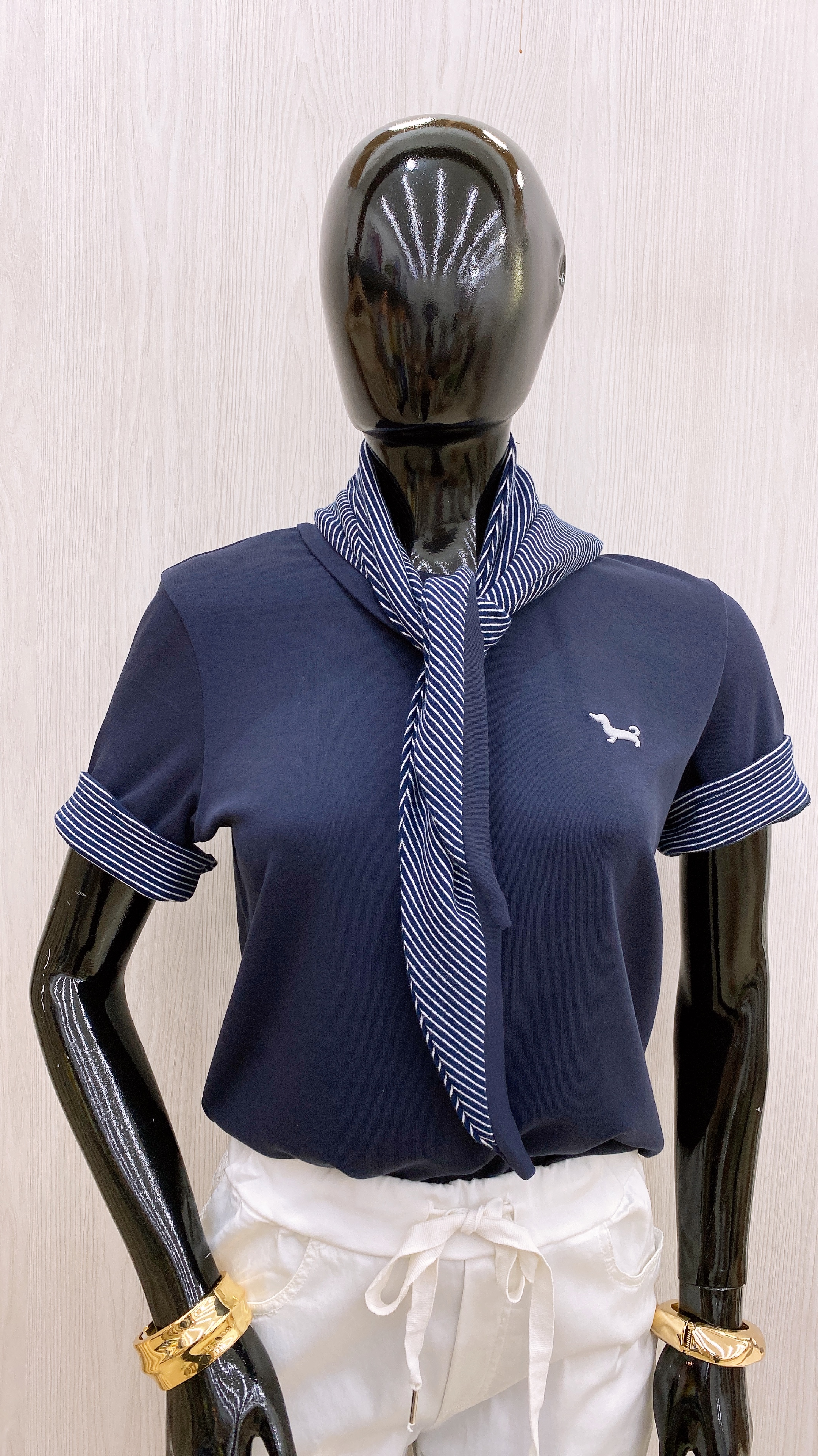 Esta es una prenda de estilo casual, en la que destaca su contraste de color en las mangas, además presenta un corte clásico que realza la silueta. Incluye un pañuelo en el mismo tono de las mangas que le da un toque distintivo al look. El tejido de su elaboración es suave y ligero, lo que nos ofrece comodidad y frescura.