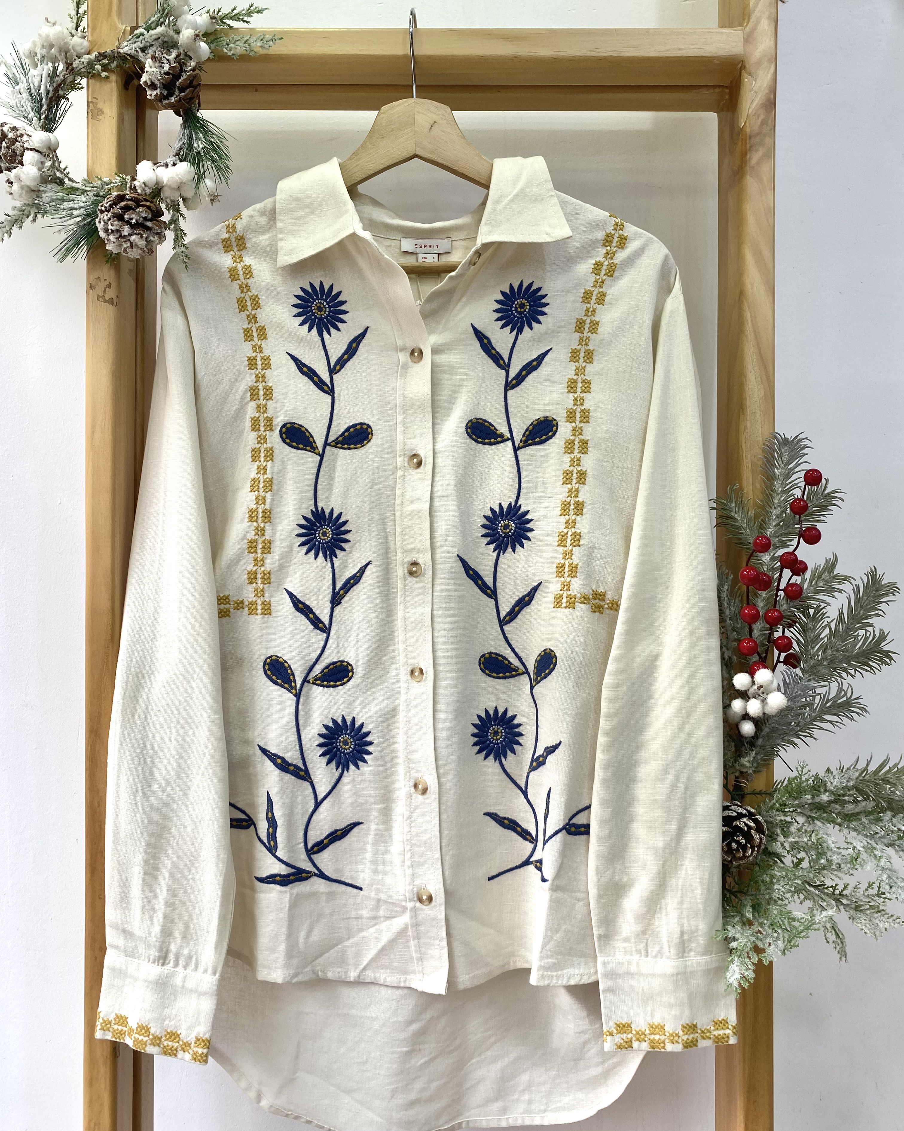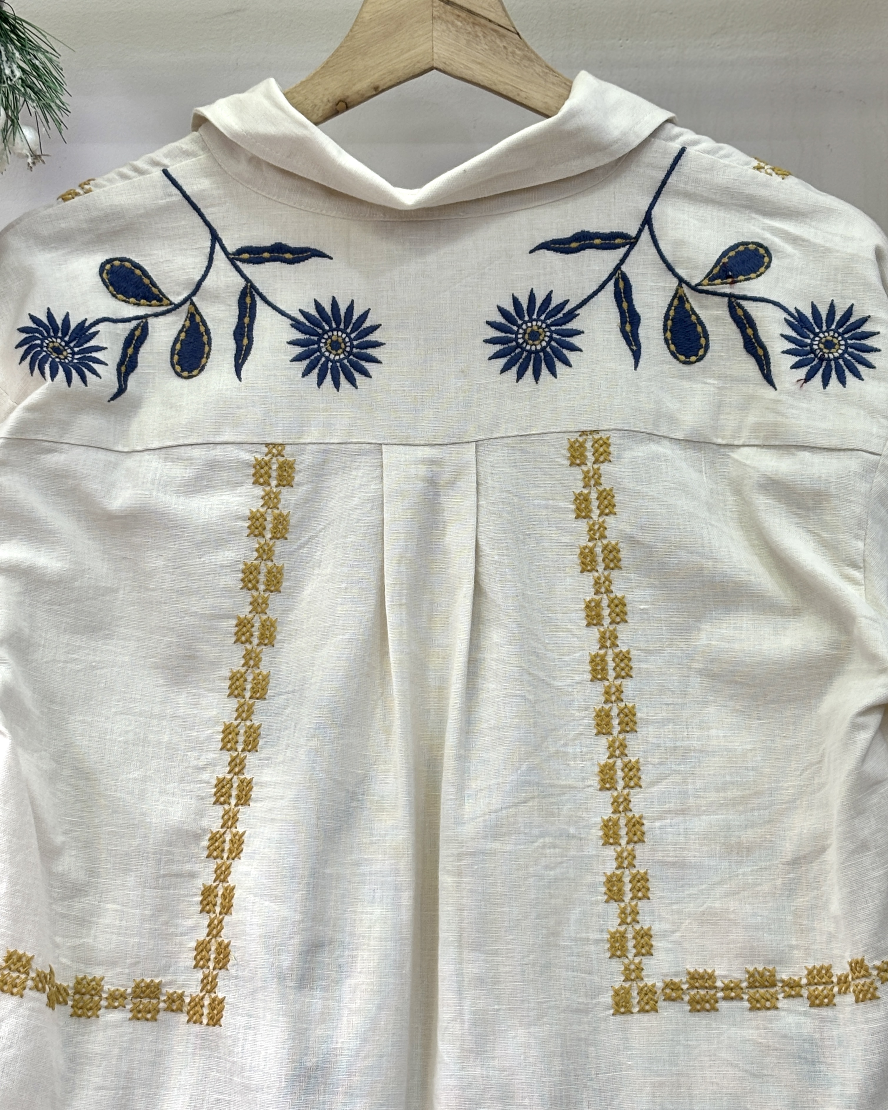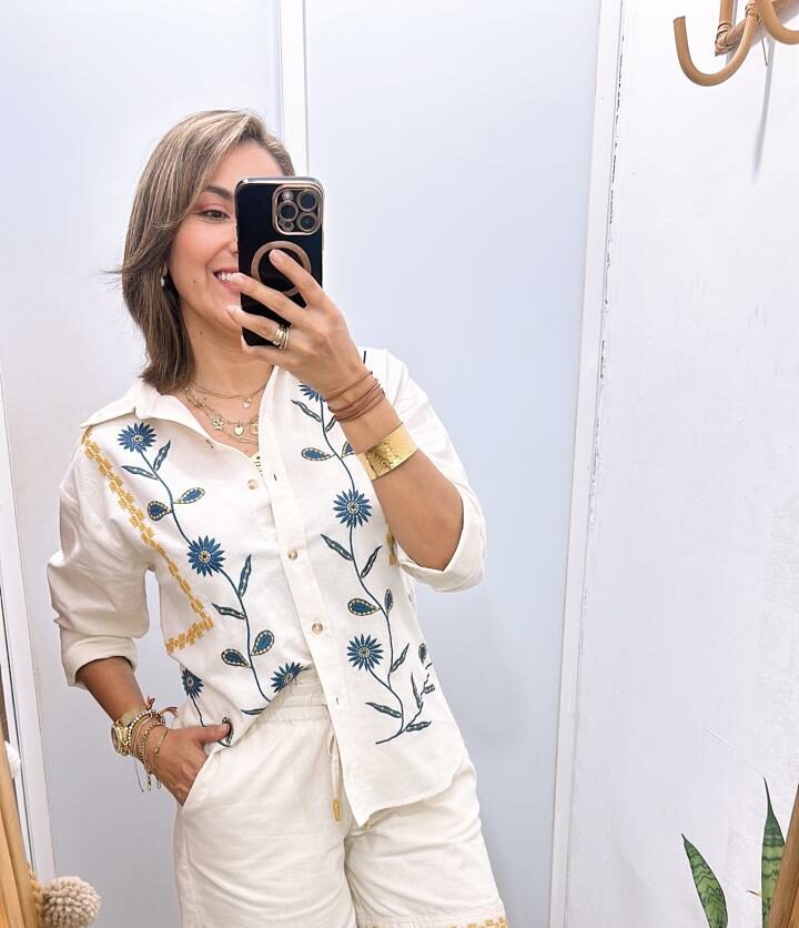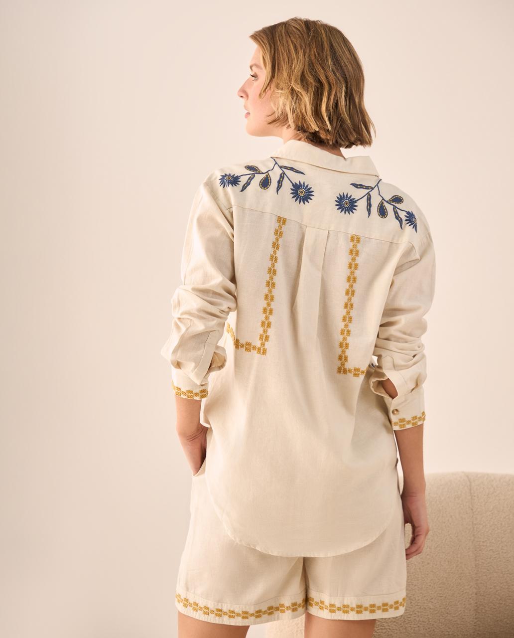 Blusa cuello clásico de manga larga con botones frontales y detalle de bordado en tonos vibrantes en frente y espalda.
