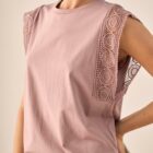 Blusa cuello redondo con detalle de encaje en los hombros, diseño elegante y femenino.