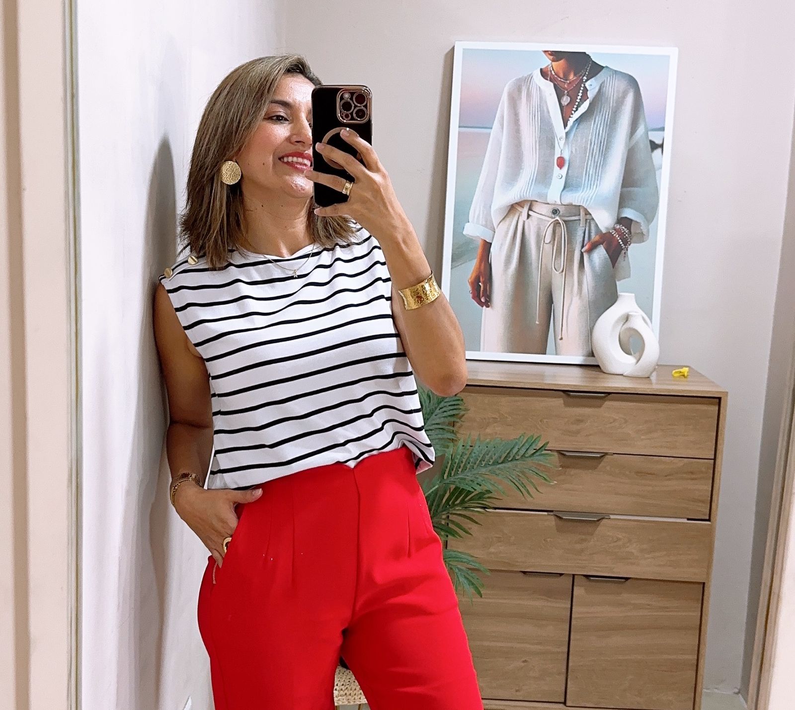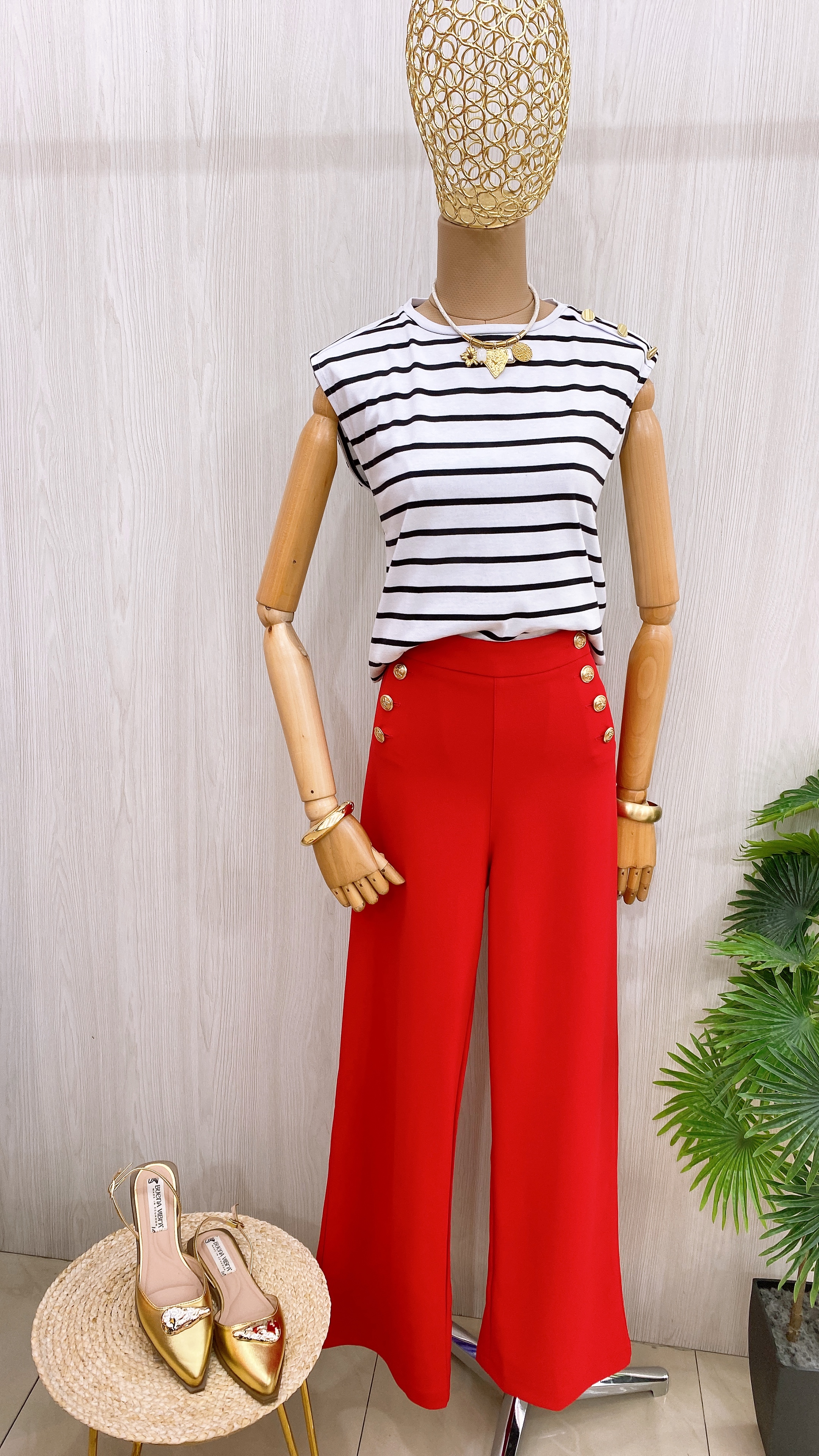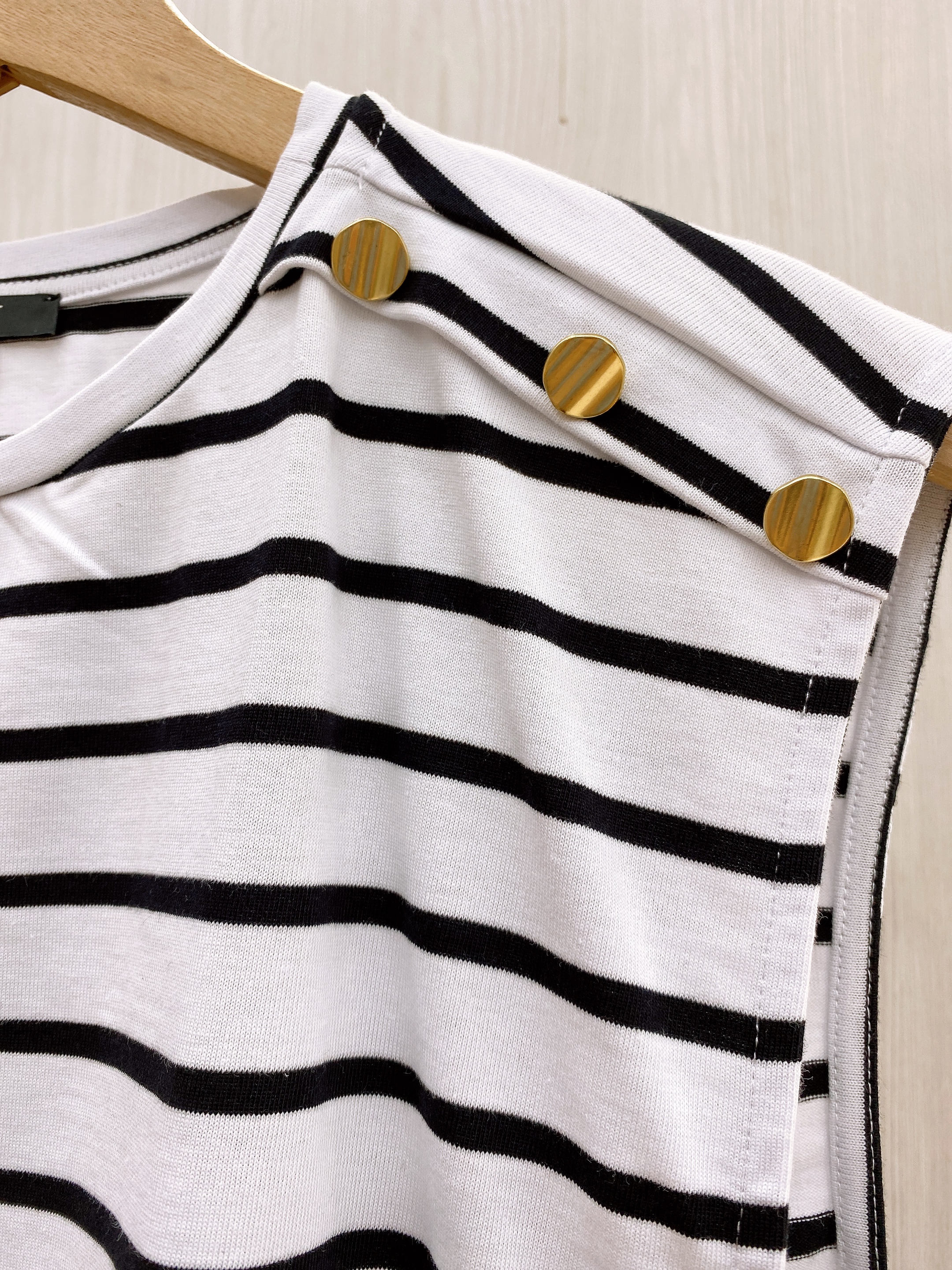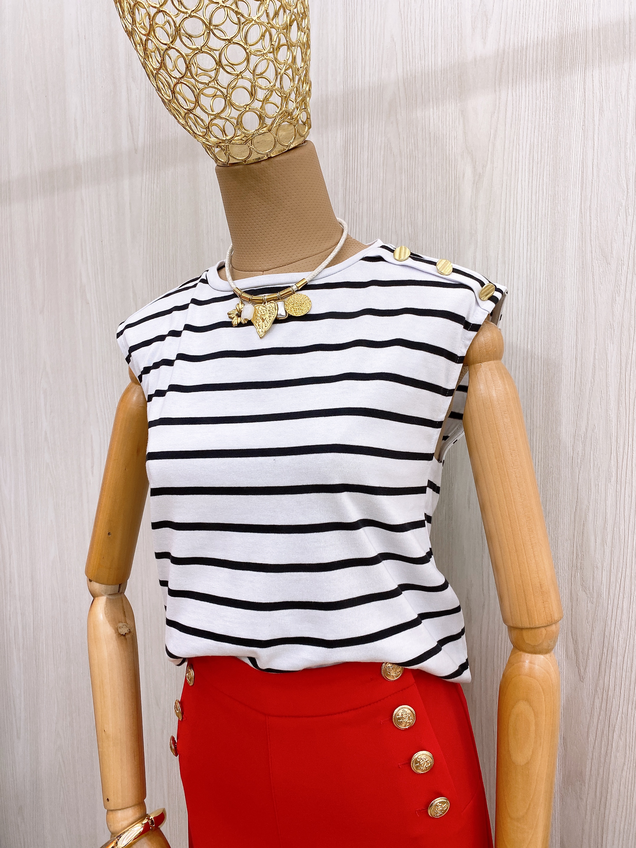 Blusa manga sisa cuello redondo a rayas negro con blanco y tiene detalle de botones dorados en hombrera.