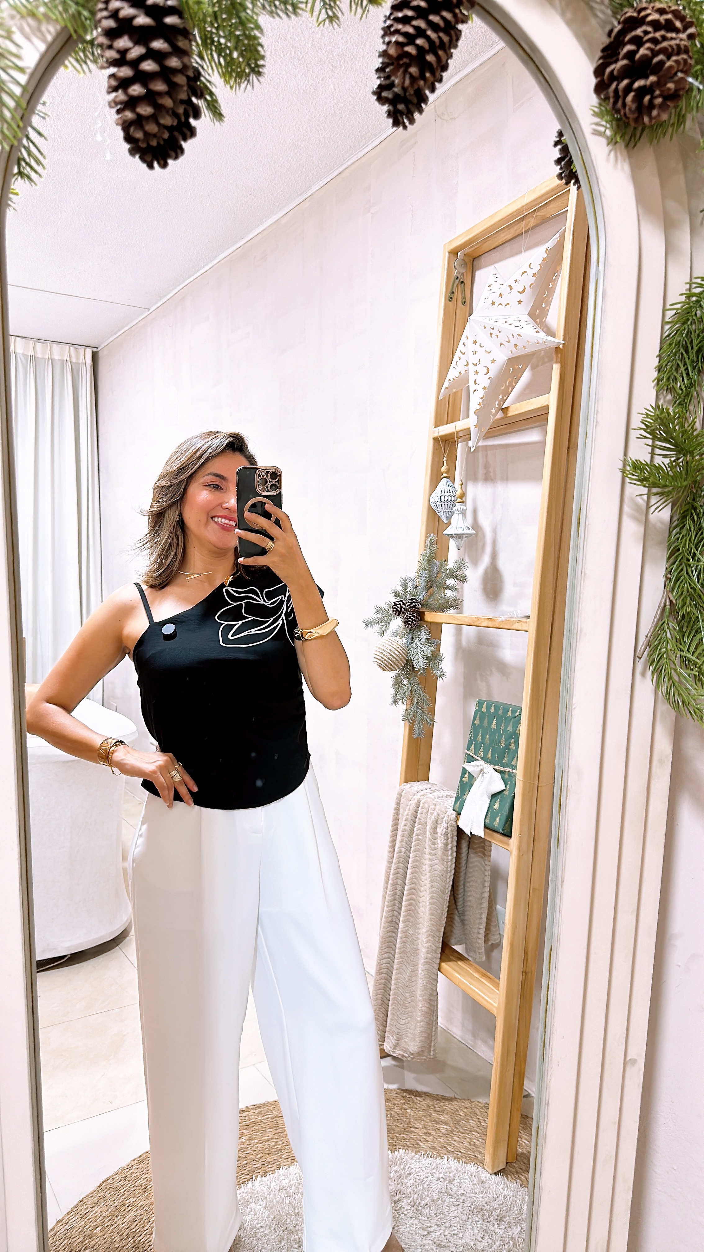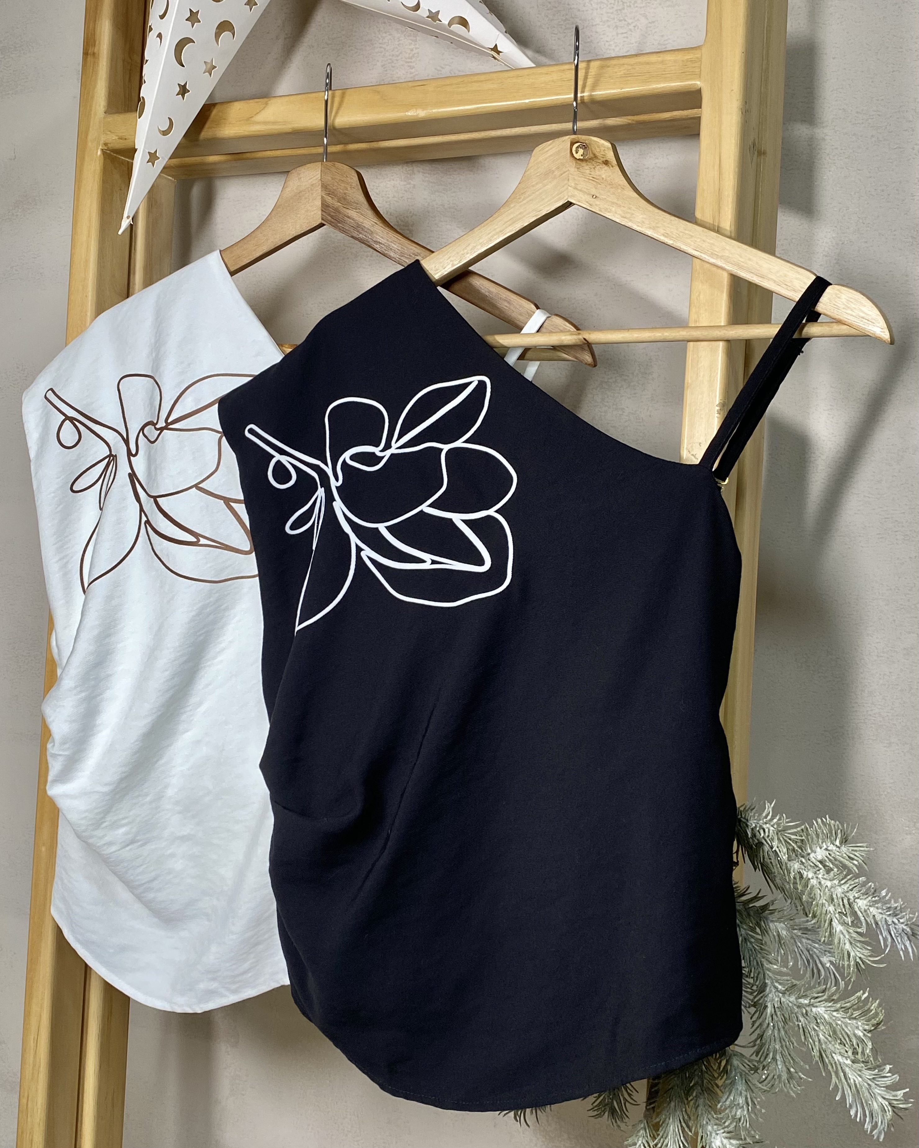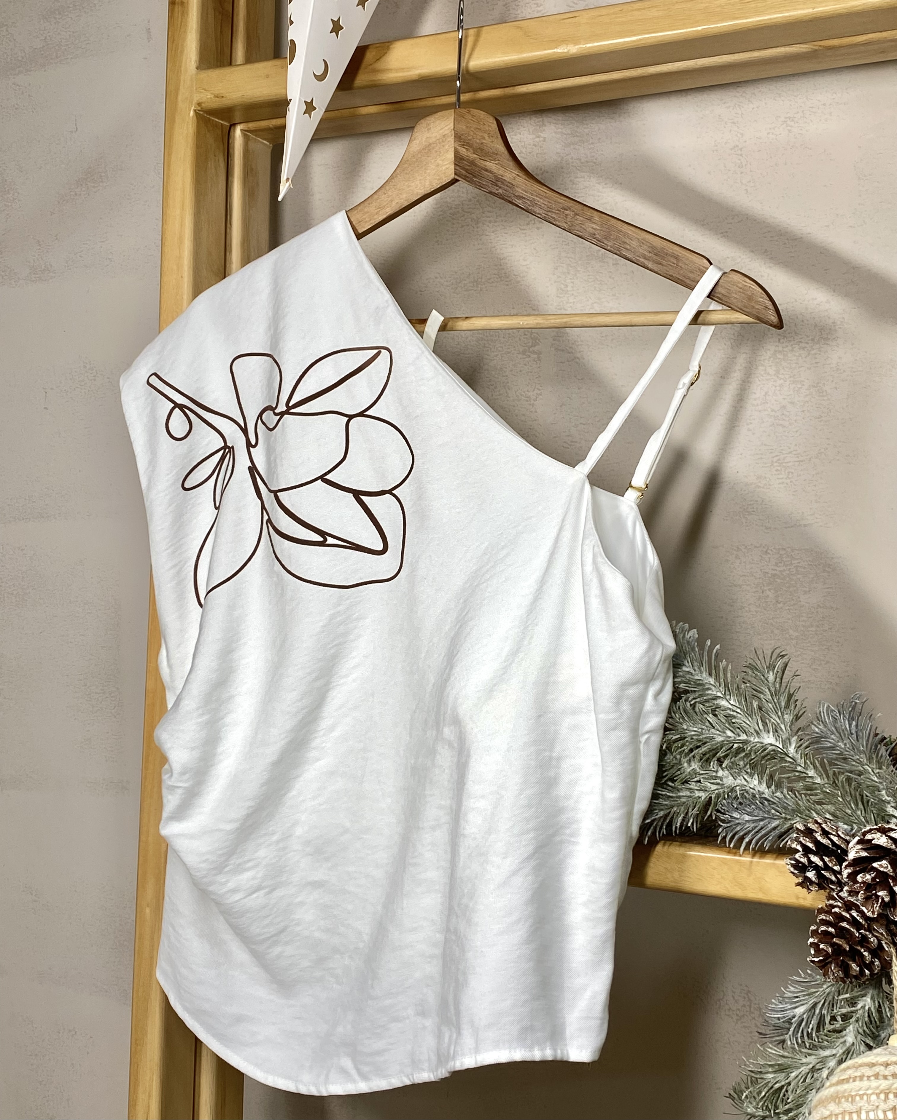 Blusa asimétrica con tirante delgado y diseño floral estampado en contraste.
