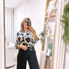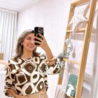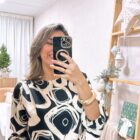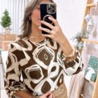 Su diseño incluye un cuello redondo clásico y un detalle de botones decorativos en el hombro. Además muestra un estampado abstracto de estilo artístico. Sus mangas largas con caída ligera y elástico en puño ofrecen un ajuste favorecedor. Esta blusa es perfecta para combinar con jeans, faldas o pantalones formales y crear looks tanto casuales como elegantes.