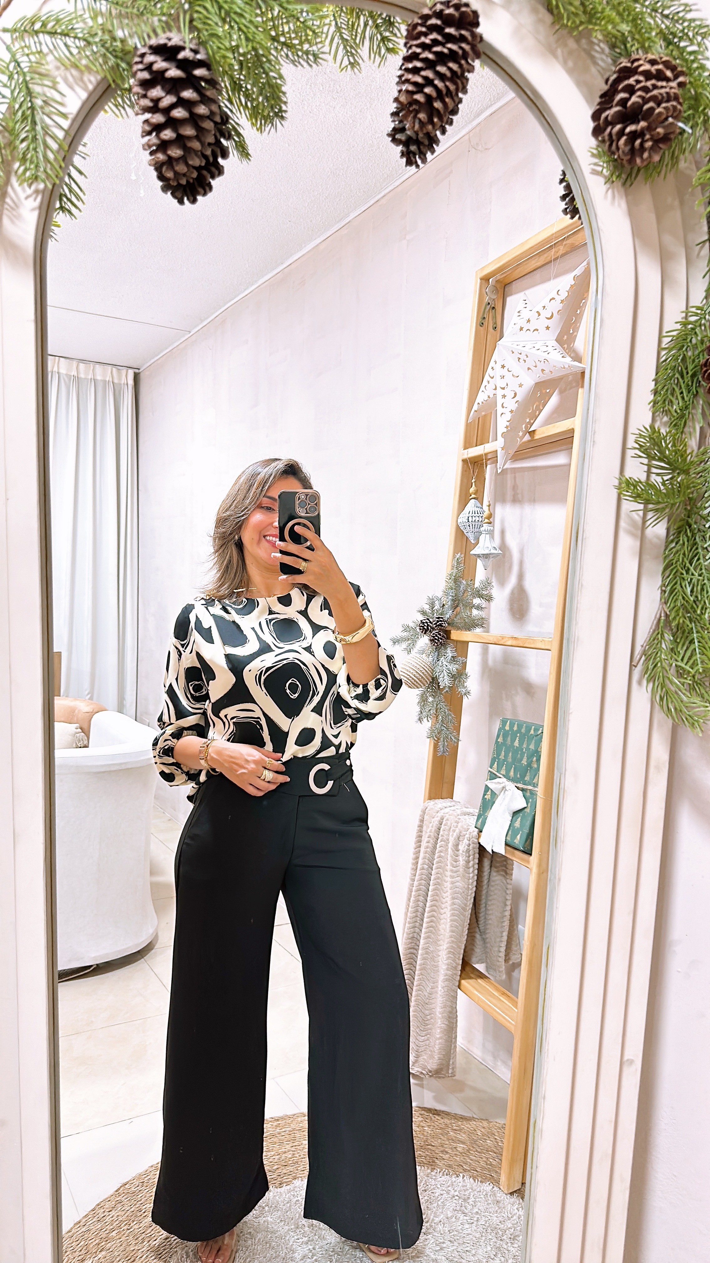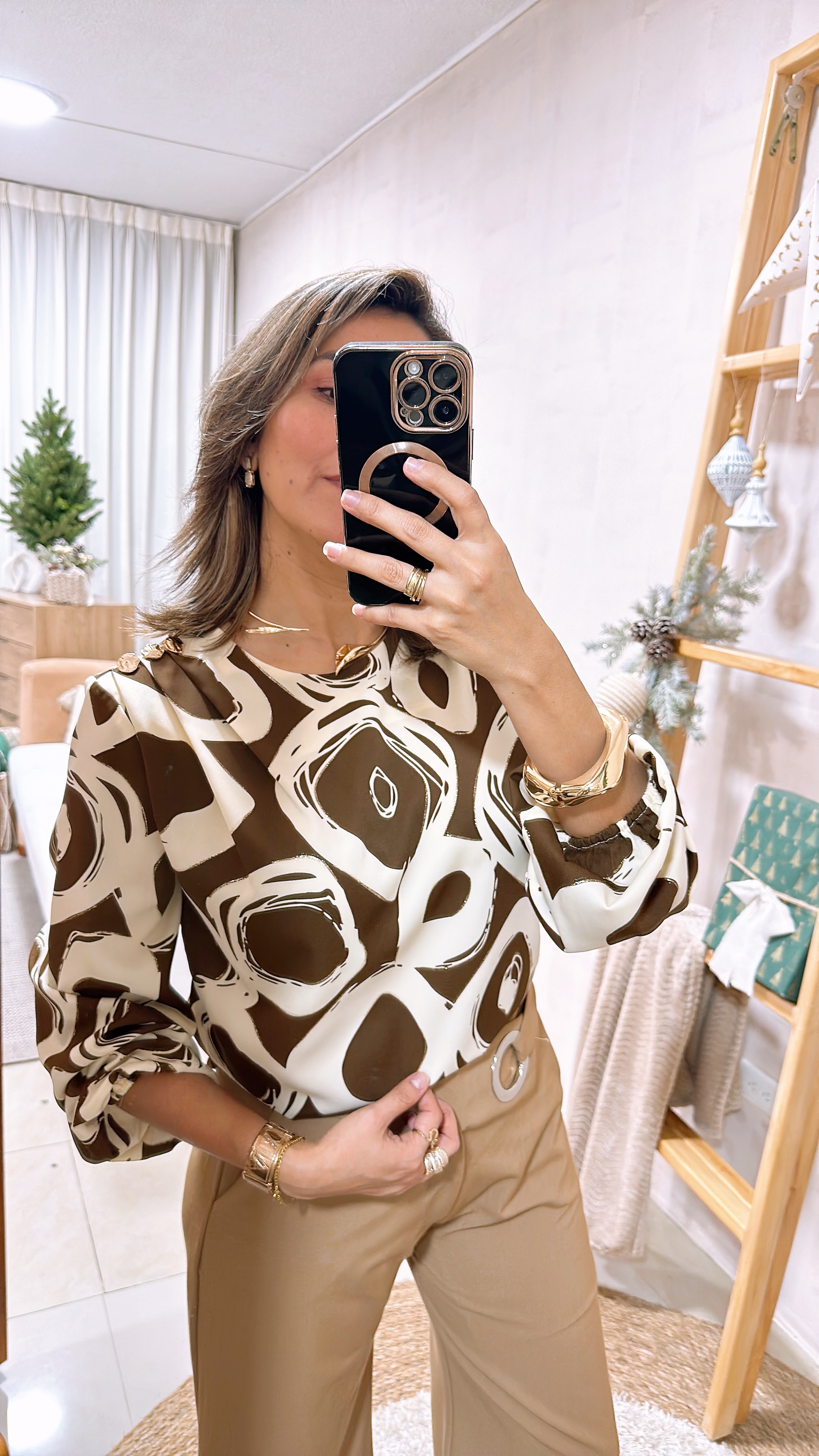 Blusa manga larga de diseño moderno con estampado abstracto y detalle de botones decorativos en el hombro.