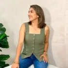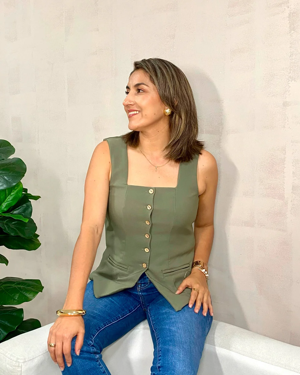Blusa estilo chaleco femenino con botones de madera y escote cuadrado.