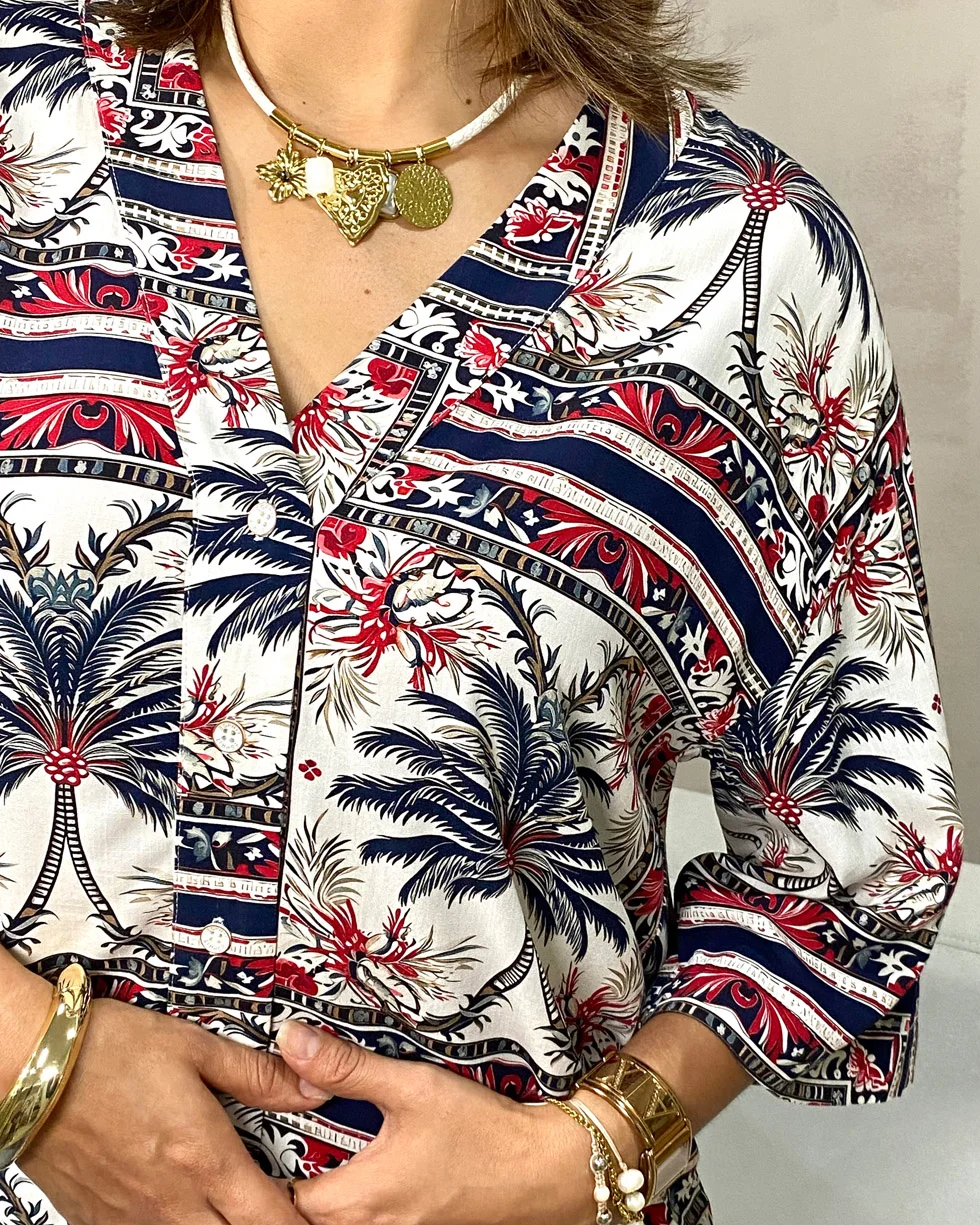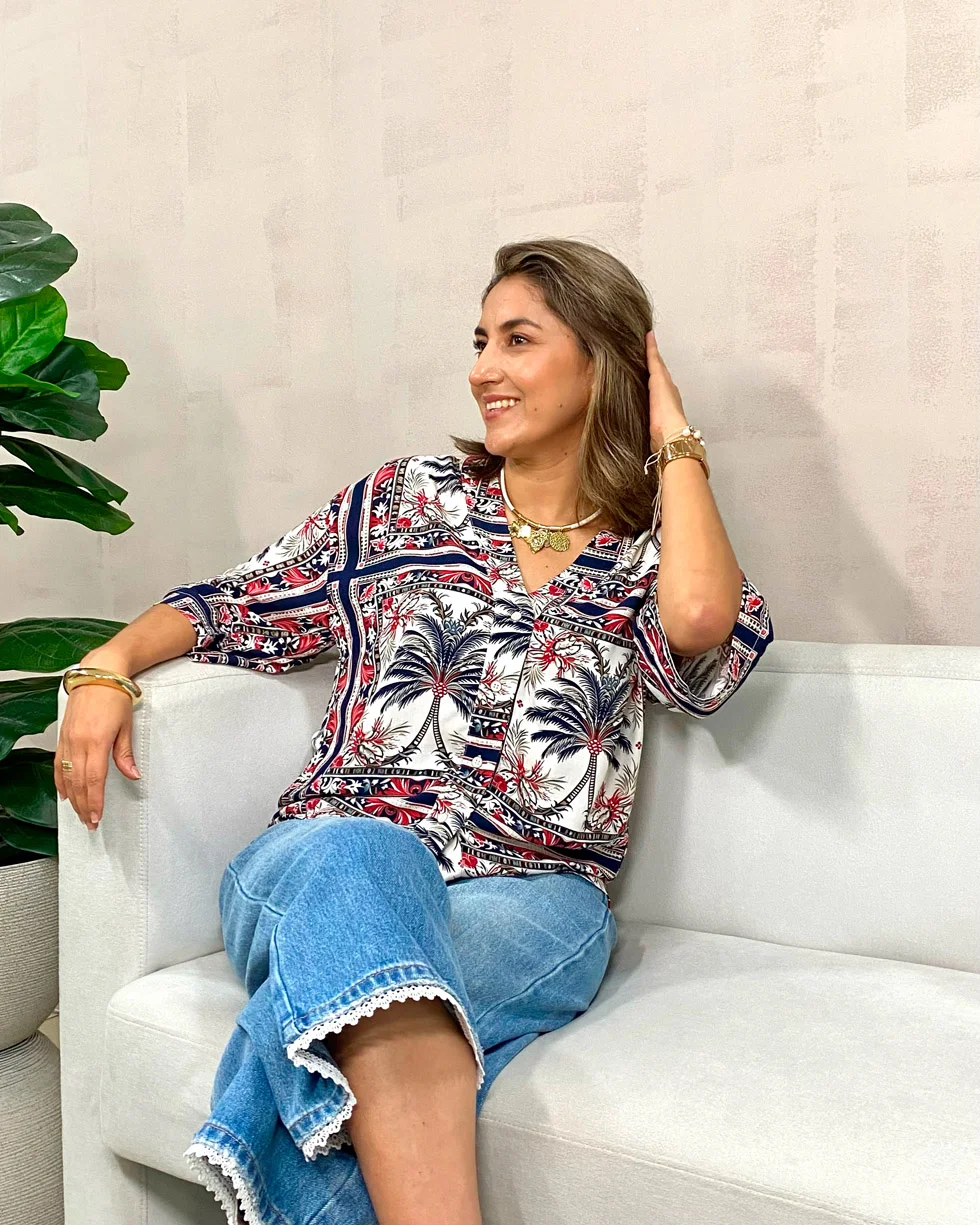 Esta es una blusa estampada de manga 3/4, con un diseño vibrante de patrón tropical con palmeras y detalles en tonos azul, rojo y blanco. Tiene un cuello en V y corte relajado, lo que la convierte en una prenda perfecta para combinar con jeans en looks casuales o también con pantalones de vestir para un look más sofisticado.