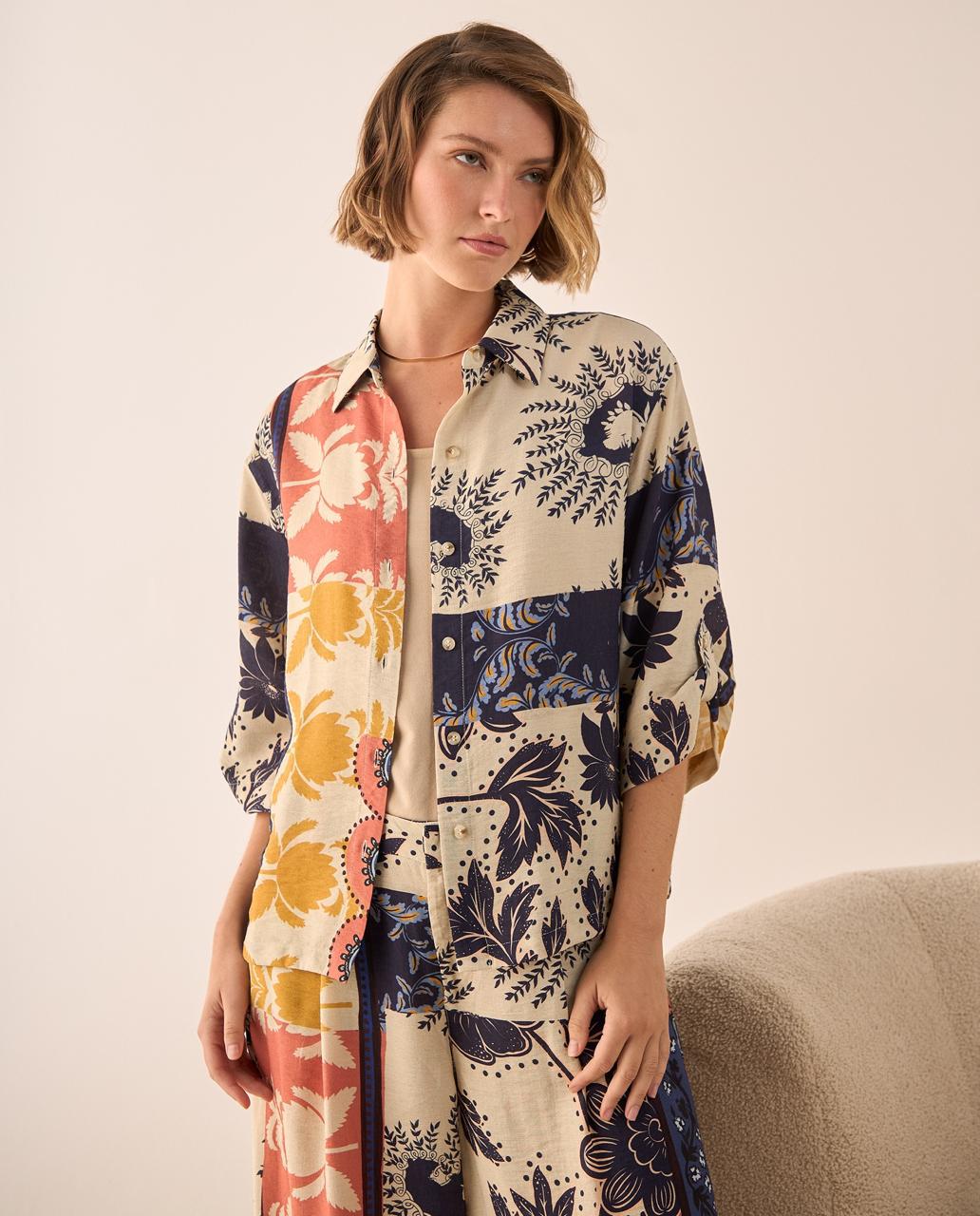 Blusa manga 3/4 con cuello estilo clásico botones frontales y estampado floral en tonos beige, azul, coral y amarillo.