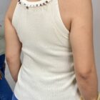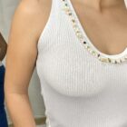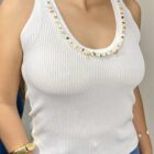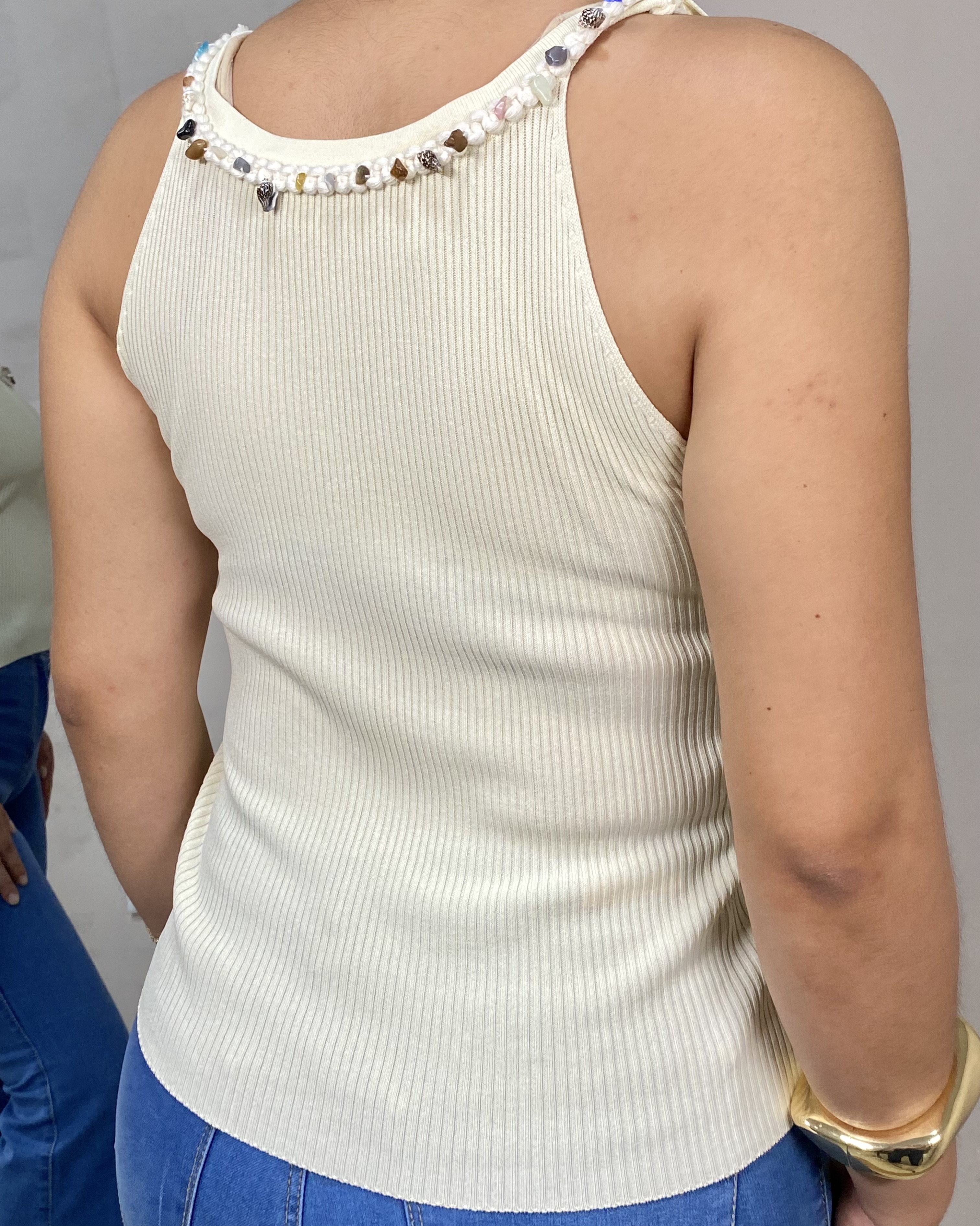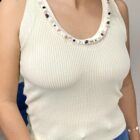 Esta blusa esta fabricada en tela acanalada elástica. Su escote redondo adornado con delicadas piedras multicolor le añade un toque artesanal. Es perfecta para combinar con jeans, faldas o pantalones de vestir, lo que nos permite crear outfits tanto casuales como looks más refinados.