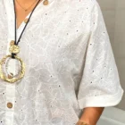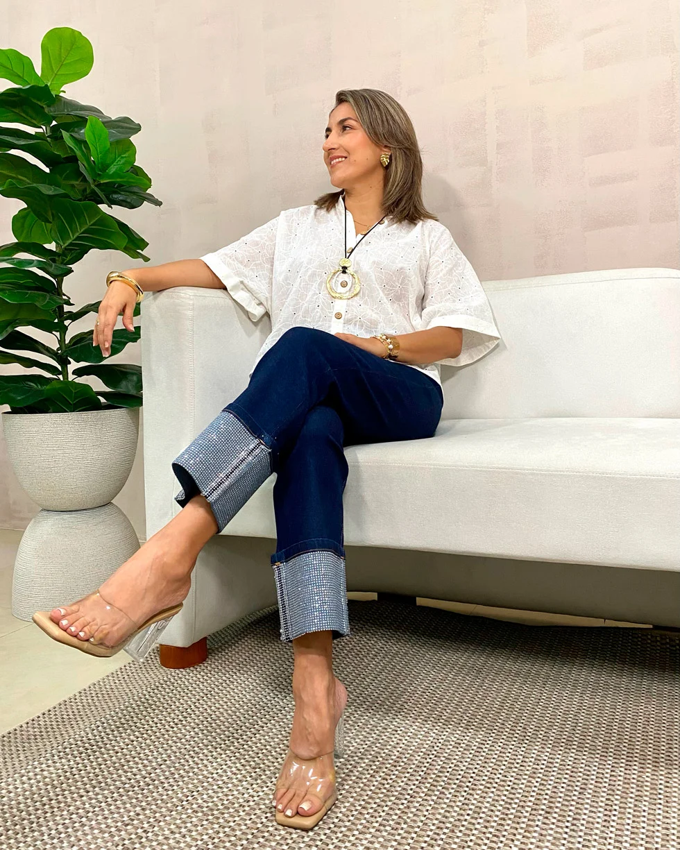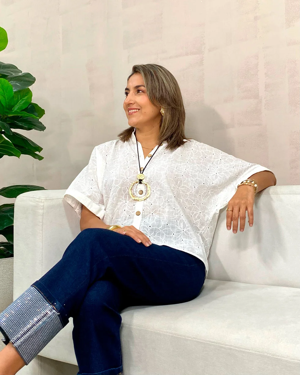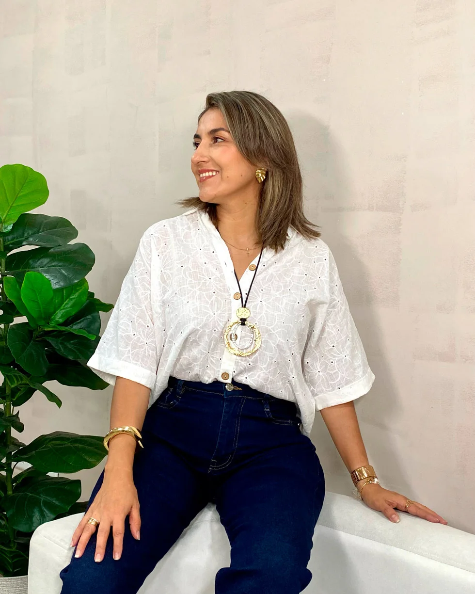 Este modelo de blusa presenta unos delicados bordados calados en patrón floral, su diseño de manga corta con botones frontales es ideal para sentir comodidad durante todo el día. Esta blusa se adapta tanto a looks casuales como elegantes.