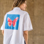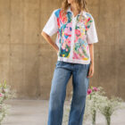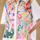Blusa manga corta cuello clásico con botones en frente y estampado artístico tonos florales.