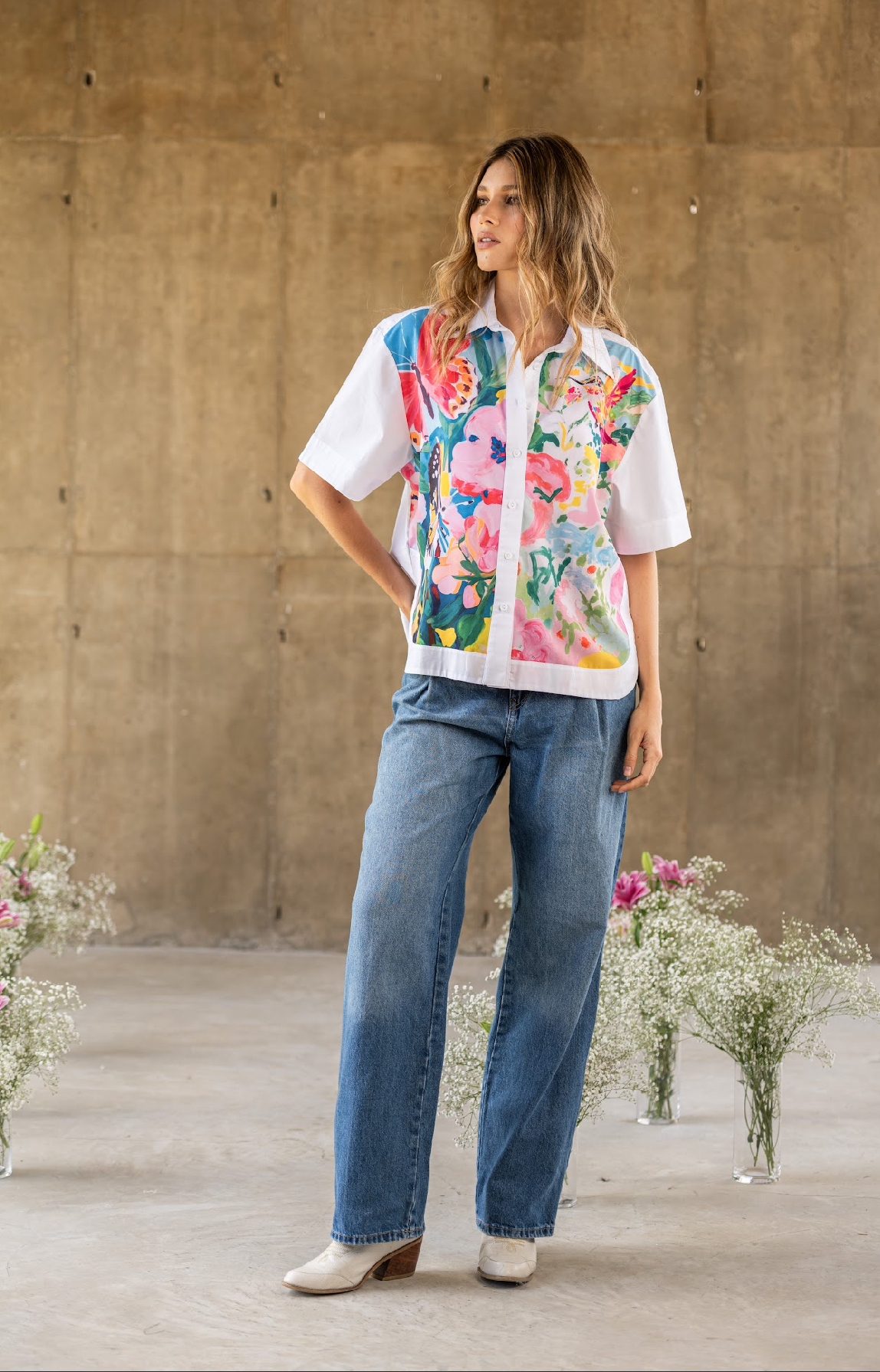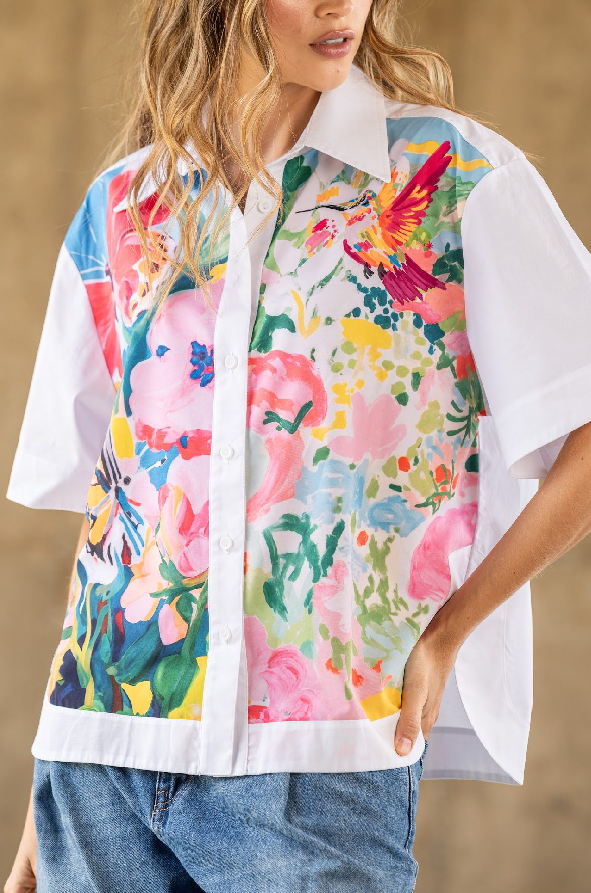 Blusa manga corta cuello clásico con botones en frente y estampado artístico tonos florales.
