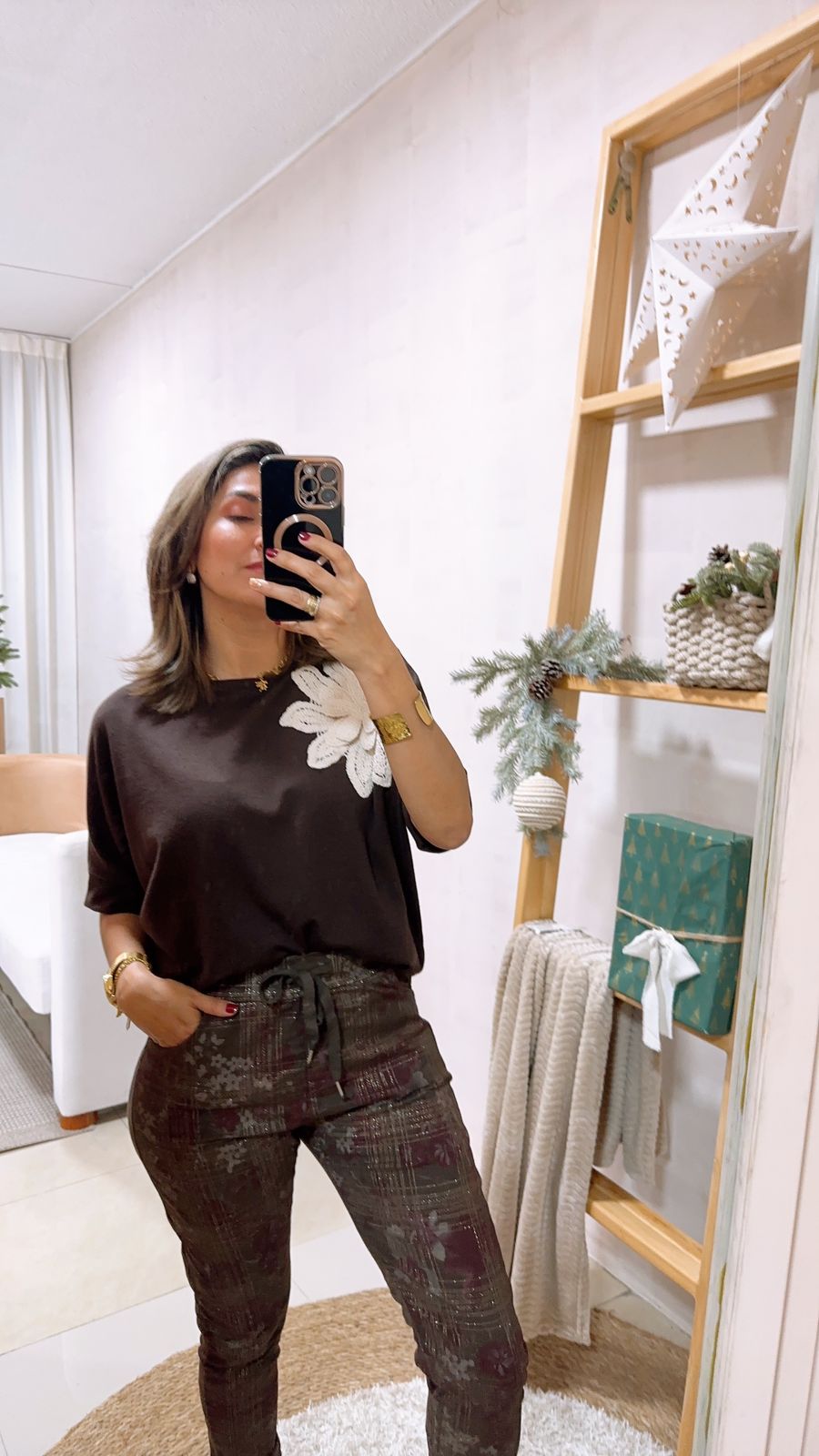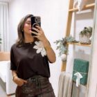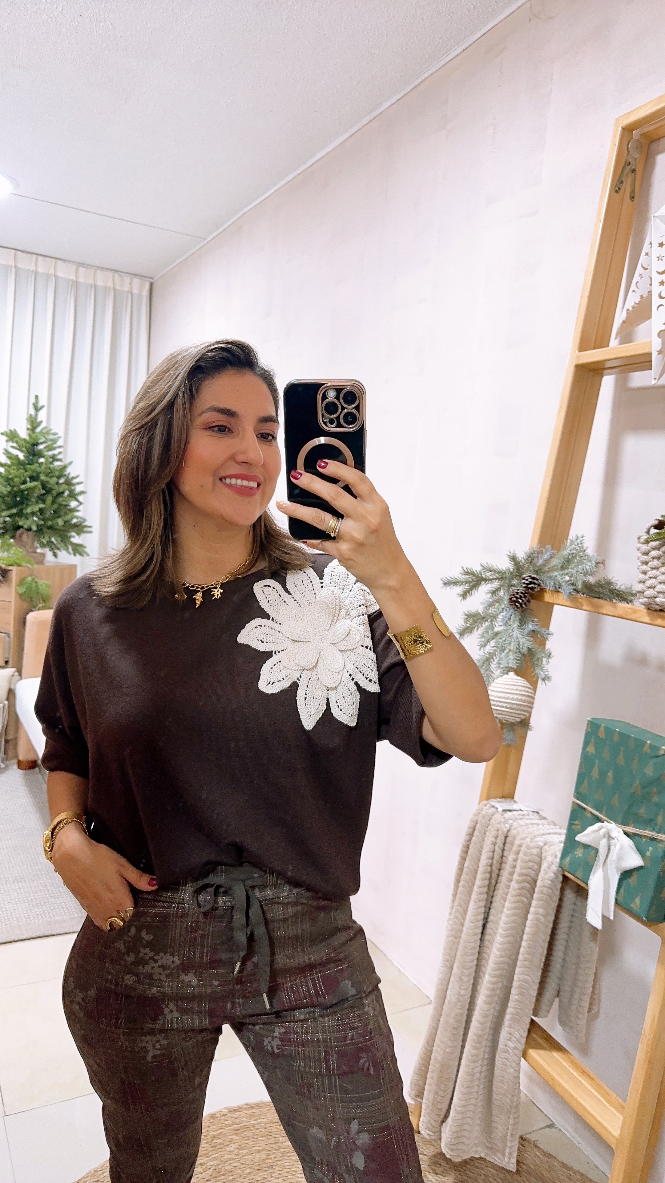 Blusa manga kimona cuello redondo y doblez en manga. Cuenta con un detalle de flor tejida en crochet.