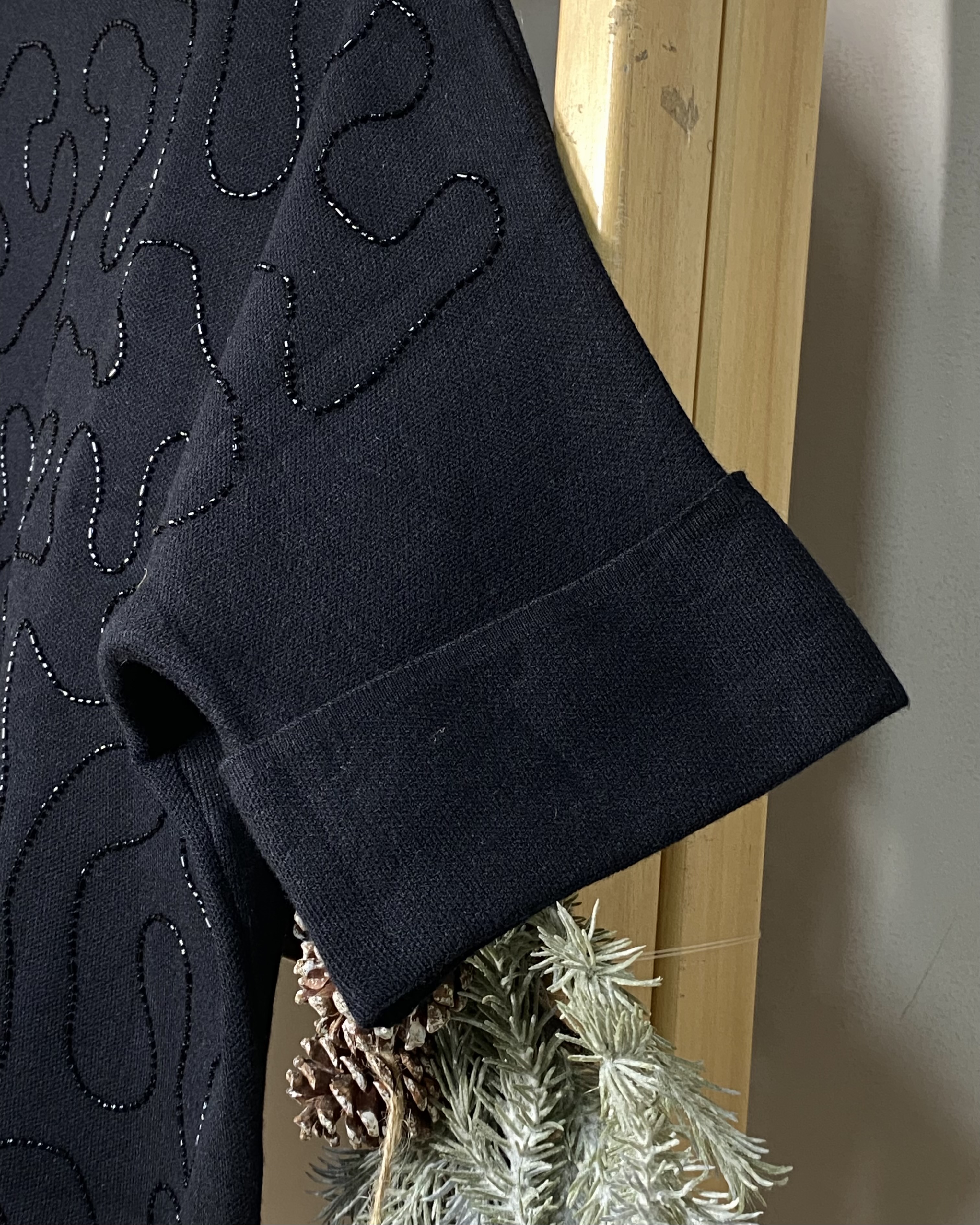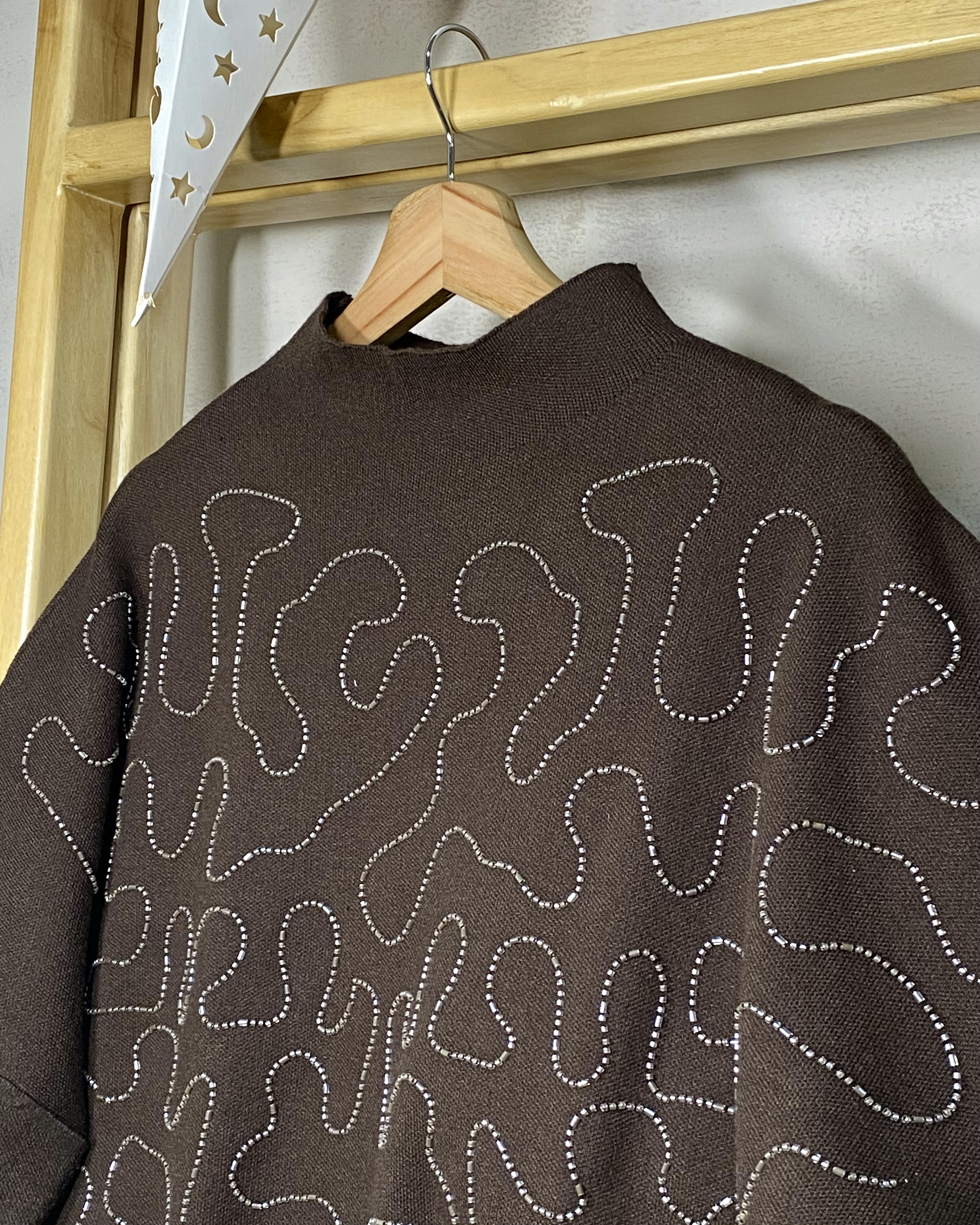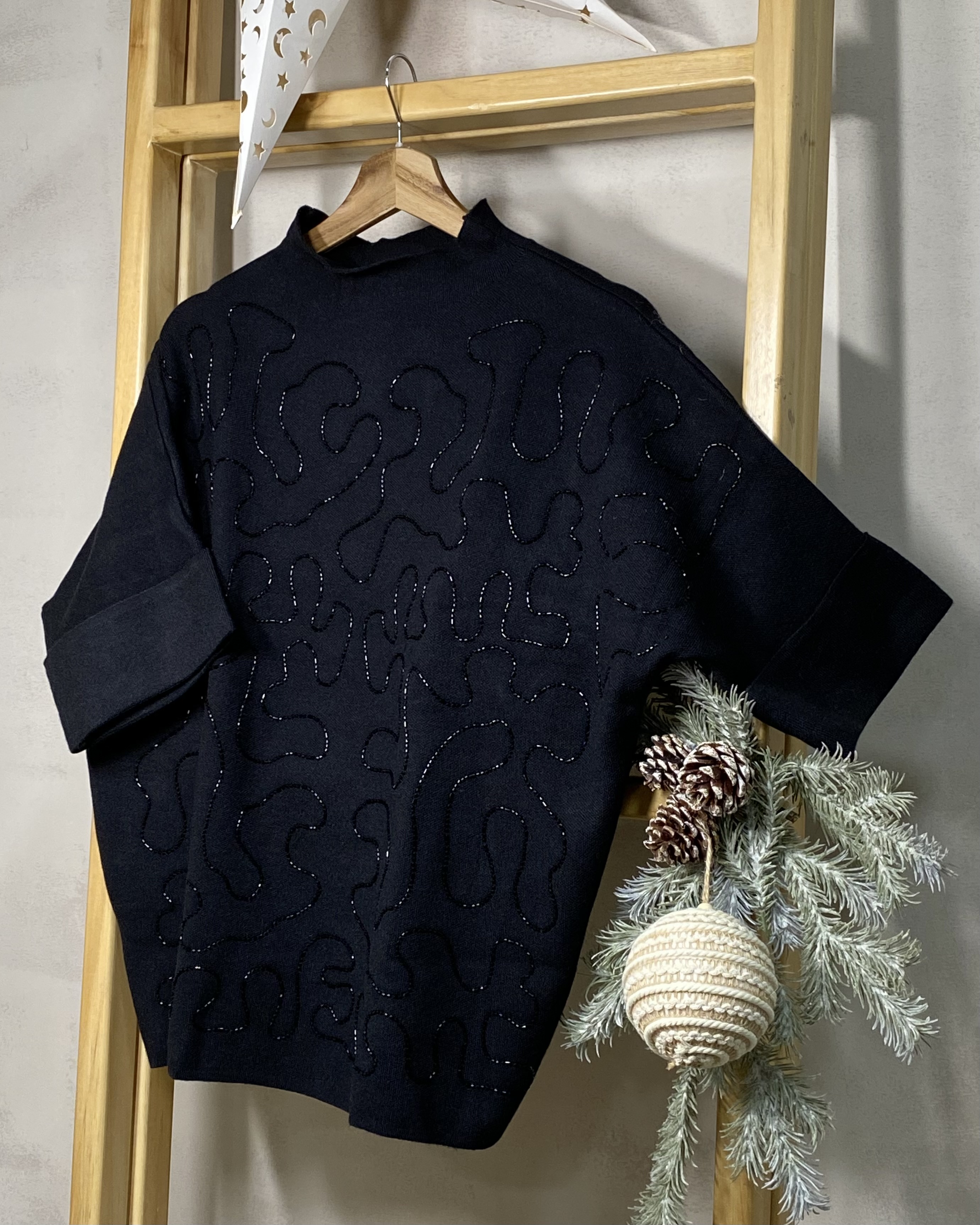 Esta blusa oversize destaca por sus delicados bordados de líneas abstractas que recorren todo el frente. Cuenta con un cuello ligeramente alto y mangas dobladas, nos ofrece un estilo relajado pero elegante. Es ideal para combinar con jeans, pantalones de vestir o faldas, para crear outfits tanto casuales como más sofisticados.