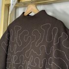 Blusa oversize vino con detalles bordados de líneas abstractas y mangas dobladas.
