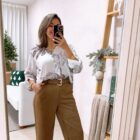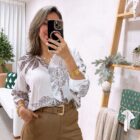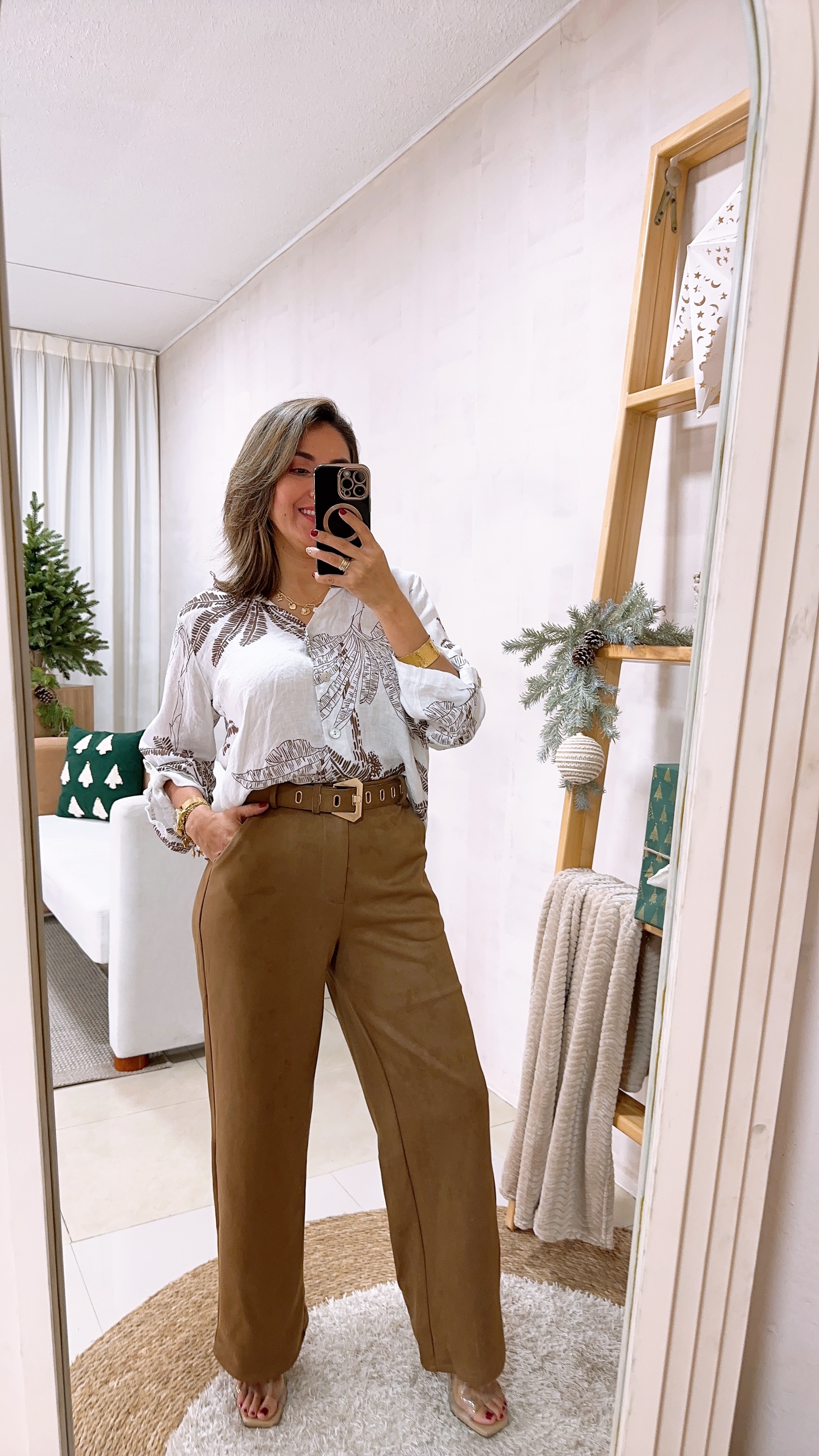 Blusa manga larga 100% Lino con botones en frente y estampado de palmeras en tono marrón.