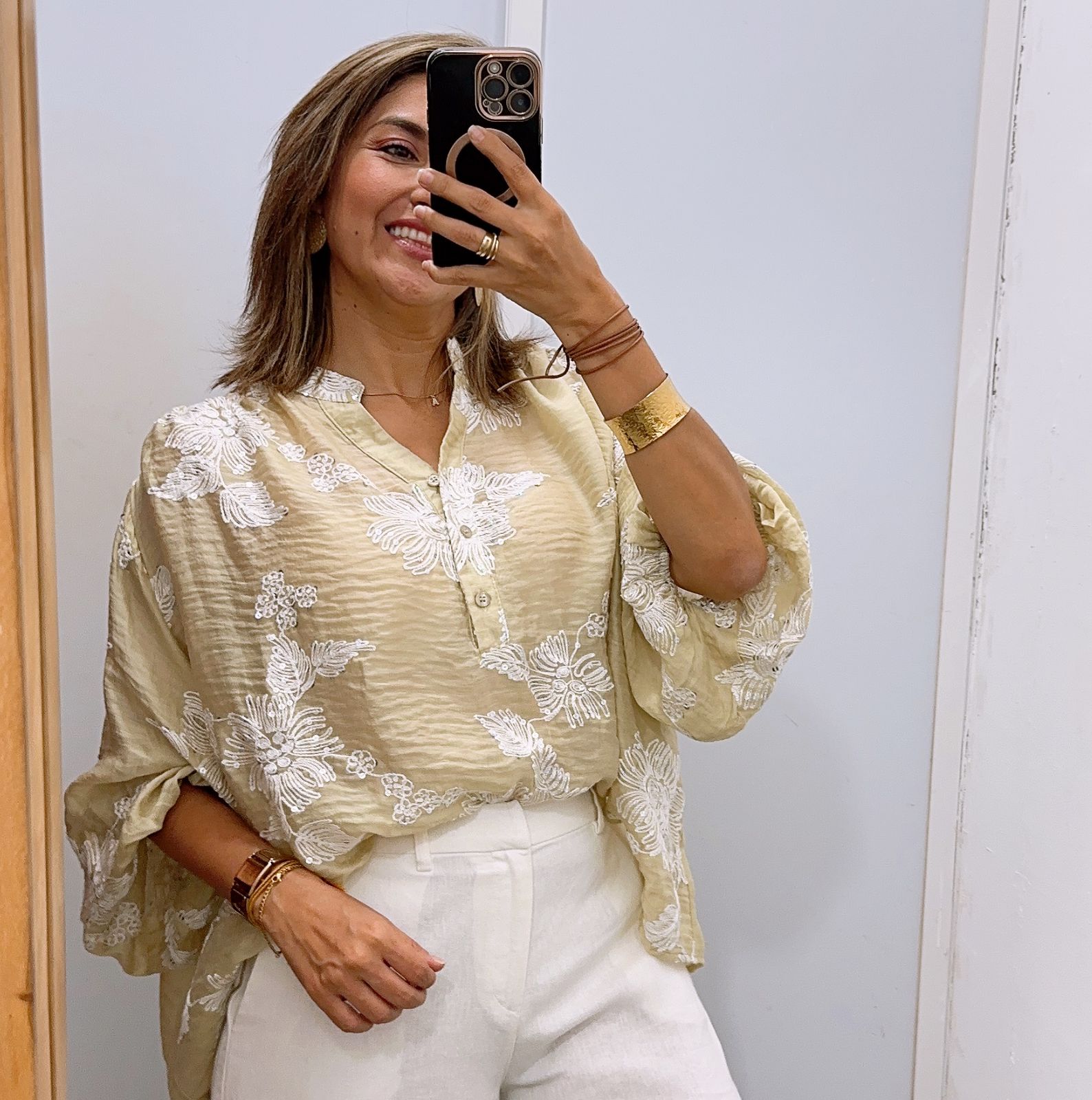 - Blusa manga larga cuello chino con bordado y lentejuelas