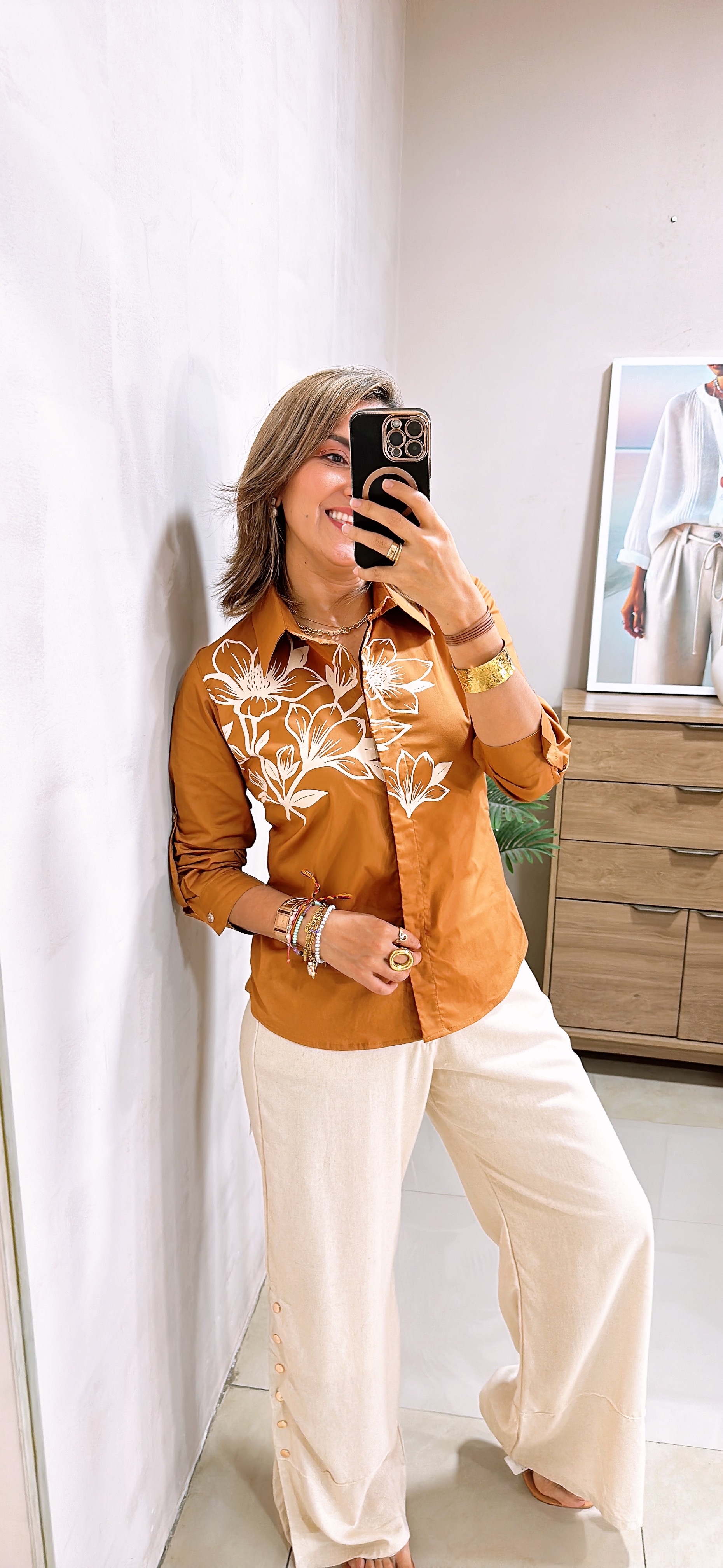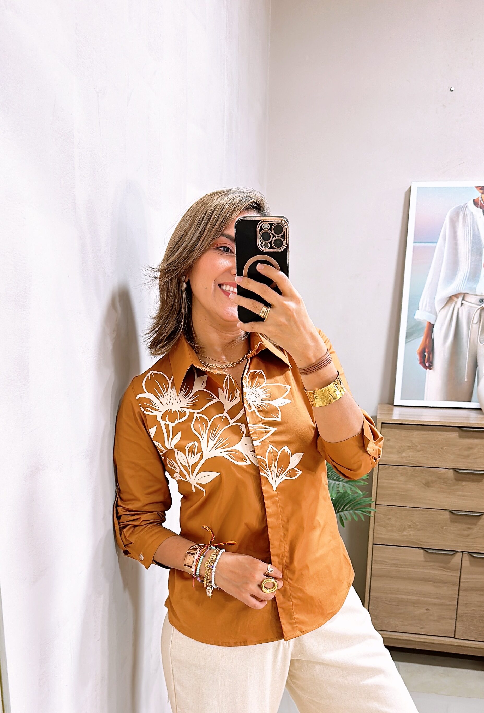 Blusa manga larga, cuello clásico y estampado floral en la parte del frente.