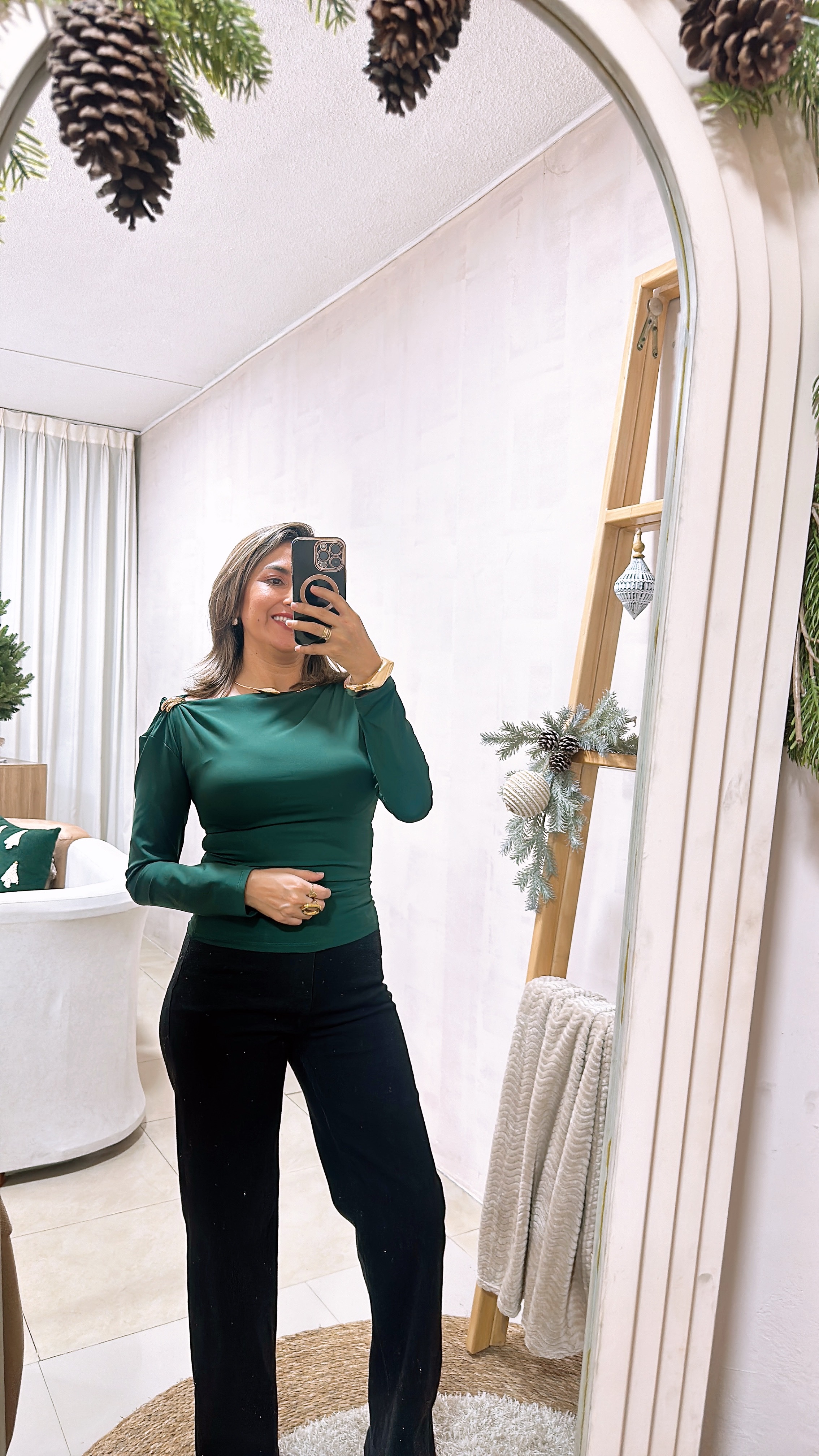 Esta es una elegante blusa manga larga con un escote drapeado y un detalle dorado en el hombro. Es perfecta para ocasiones especiales o eventos mas elegantes. La podemos combinar fácilmente con pantalones formales, faldas o jeans y para crear outfits impactantes la podemos combinar con bisutería dorada.