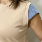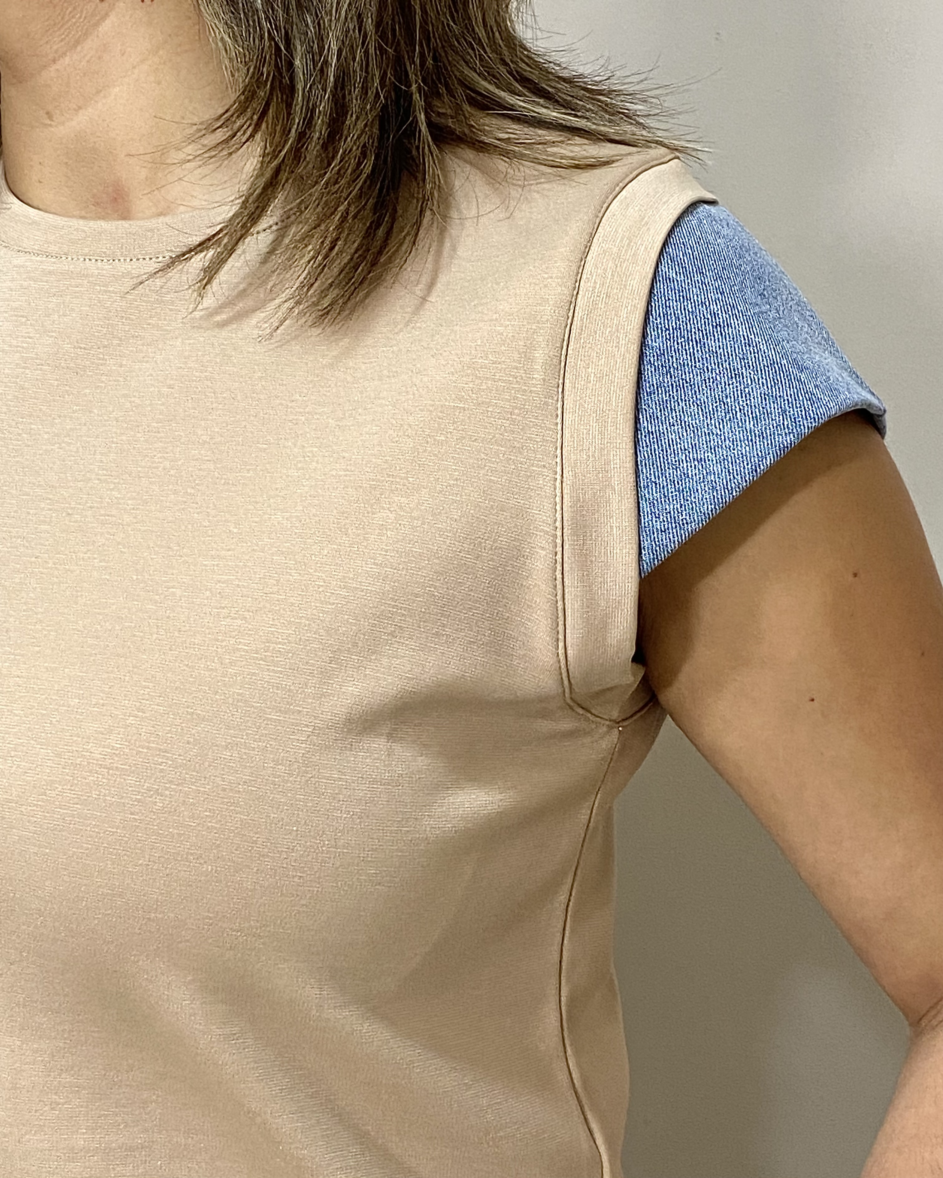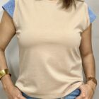 Blusa muscle tee en tonos neutros con combinación en tono azul denim.