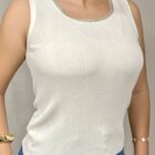 Esta blusa de manga sisa esta confeccionada en tela acanalada de tacto suave y elástico. Su escote redondo adornado con delicados brillos le aporta un toque elegante, esta prenda es perfecta para combinar tanto con jeans, faldas o pantalones de vestir y crear atuendos tanto casuales como más formales.