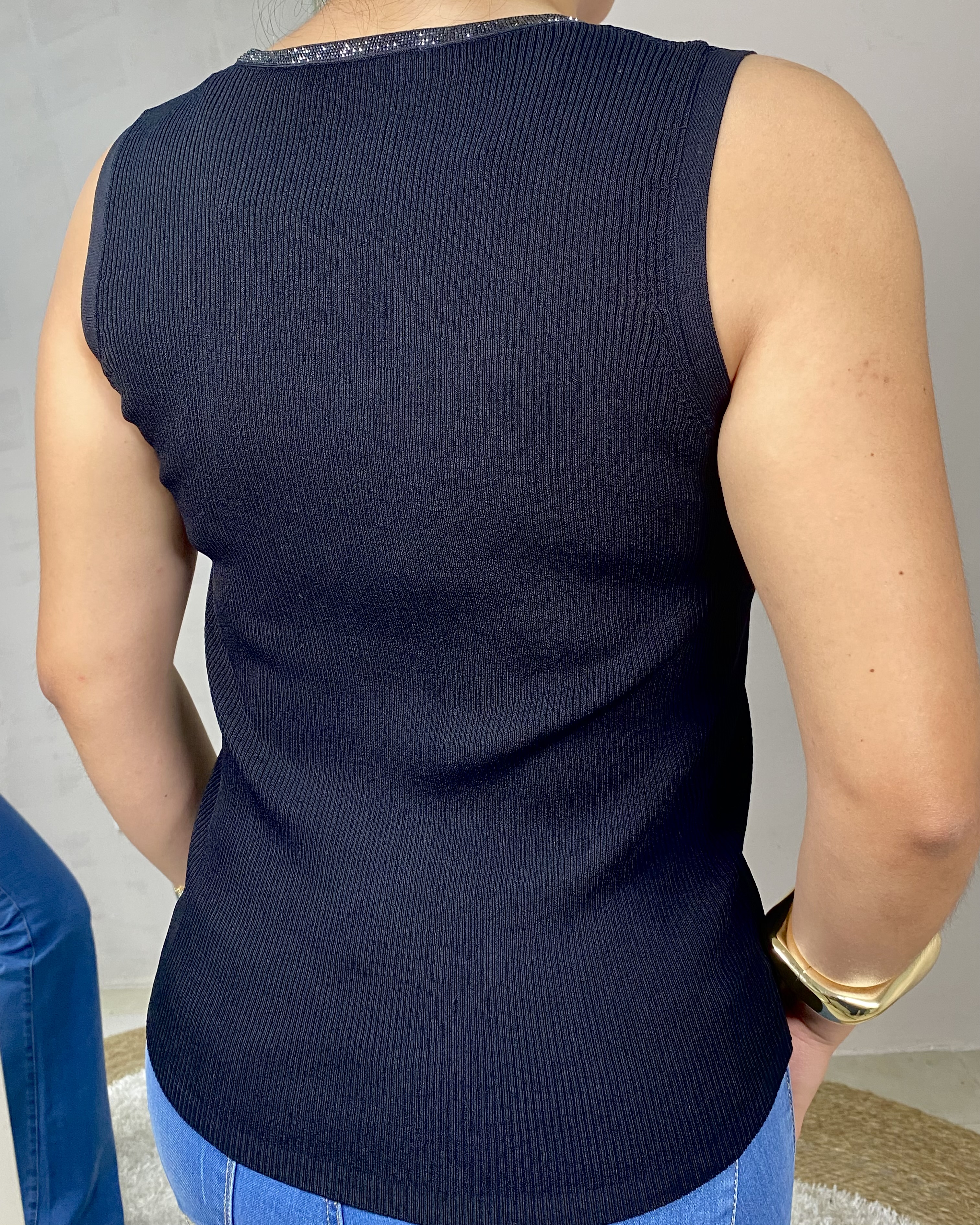 Blusa sin mangas con textura acanalada y detalle brillante en el escote.