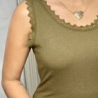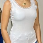 Blusa blanca sin mangas de tejido acanalado con delicado encaje en el escote y bordes.