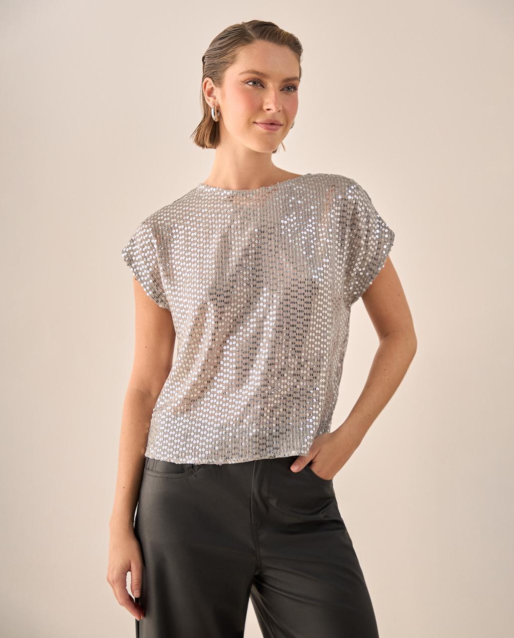 Blusa manga sisa, cuello redondo en tono plateado cubierta de lentejuelas toda la superficie.