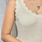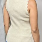 Esta es una blusa tejida sin mangas que presenta un delicado escote en V con terminaciones en ondas. Su tejido acanalado se ajusta a la silueta permitiendo lucir de cómoda en cualquier ocasión. Es perfecta para combinar con jeans, faldas o pantalones de vestir, adaptándose tanto a outfits casuales como a looks más sofisticados.