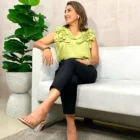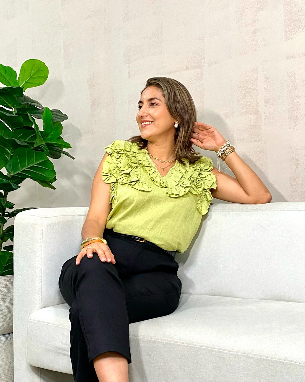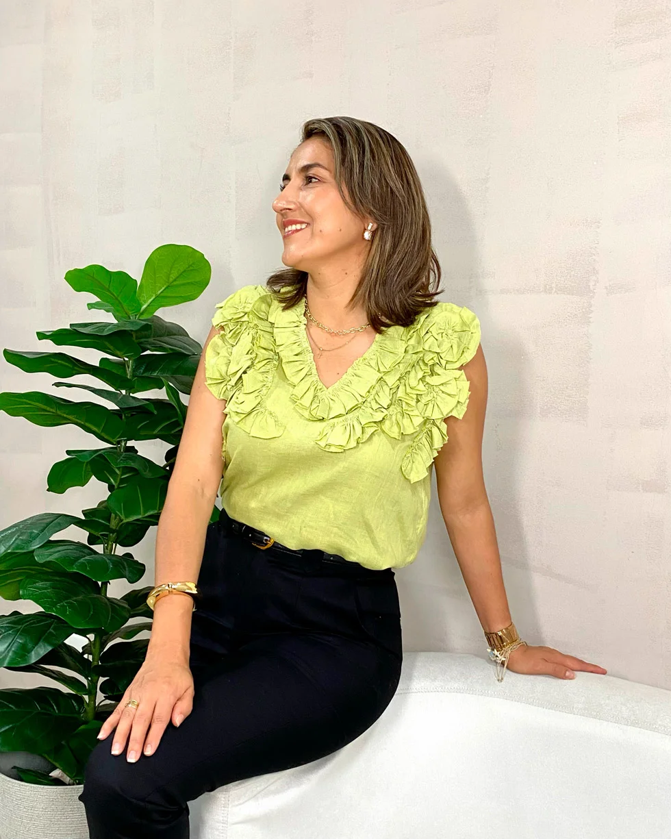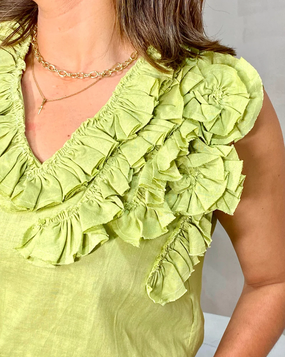 Esta prenda está confeccionada en lino de alta calidad, que es una tela ligera y transpirable. Tiene un corte sin mangas y escote en V, además, su diseño es realzado por las aplicaciones de flores y volantes elaborados a mano. Esta blusa es ideal para usarla con pantalones, faldas o shorts tanto en el día como en la noche.