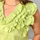 Blusa manga sisa confeccionada en lino con detalles de flores y volantes hechos a mano.