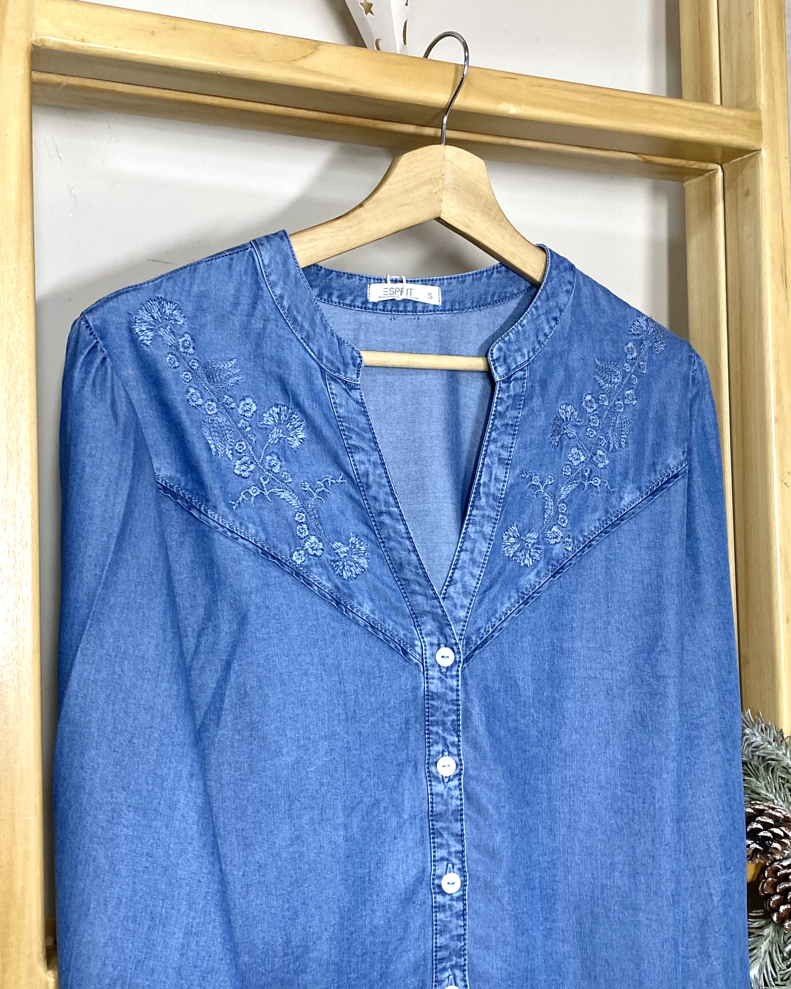Camisa en denim de manga larga y cuello en V con detalle bordado y botones frontales.