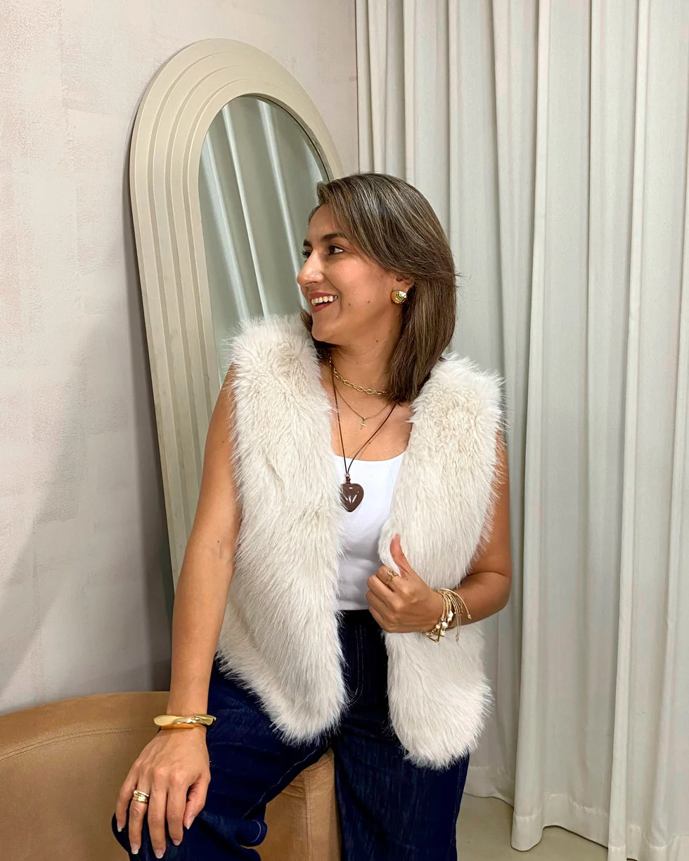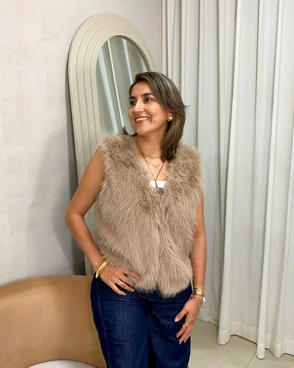 Este chaleco efecto pelo es la prenda perfecta para darle un toque chic a nuestros looks. Cuenta con un diseño sin mangas con textura suave y esponjosa que nos aporta calidez a nuestro outfit. Lo puedes combinar con jeans, blusas o vestidos para lograr un look más moderno en cualquier temporada.