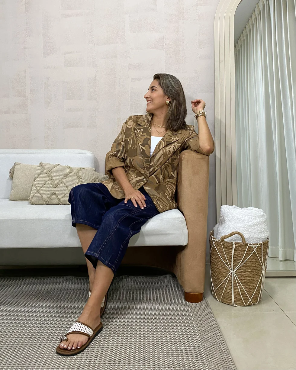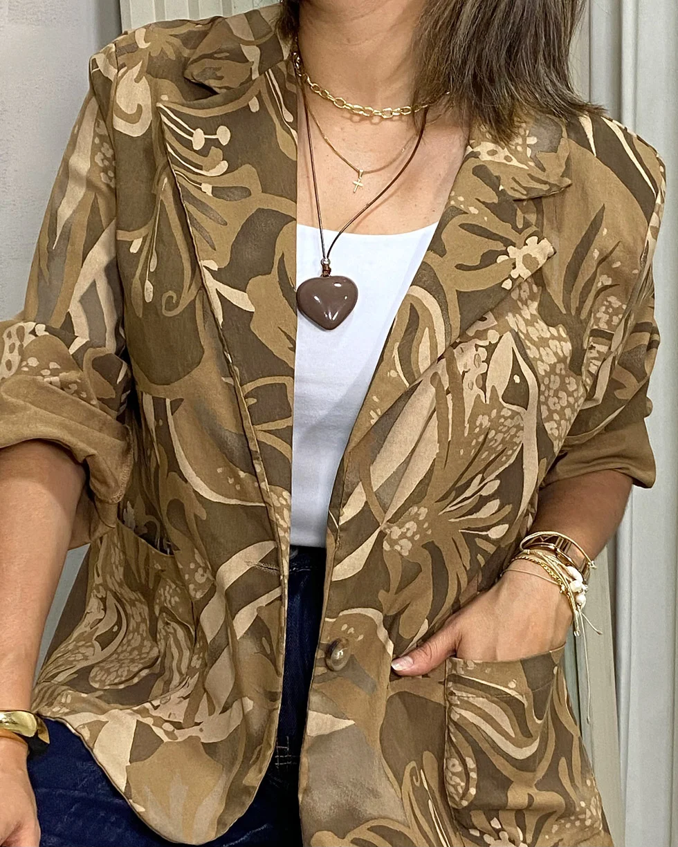 Chaqueta oversize con estampado tropical en tonos tierra.