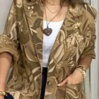 Esta chaqueta oversize de diseño estampado en tonos tierra presenta un patrón inspirado en la naturaleza, mangas largas y bolsillos prácticos. Su corte holgado la hace fácil de combinar con jeans, pantalones clásicos o vestidos. La podemos llevar desde un look casual de día hasta un atuendo elegante de noche.