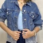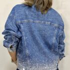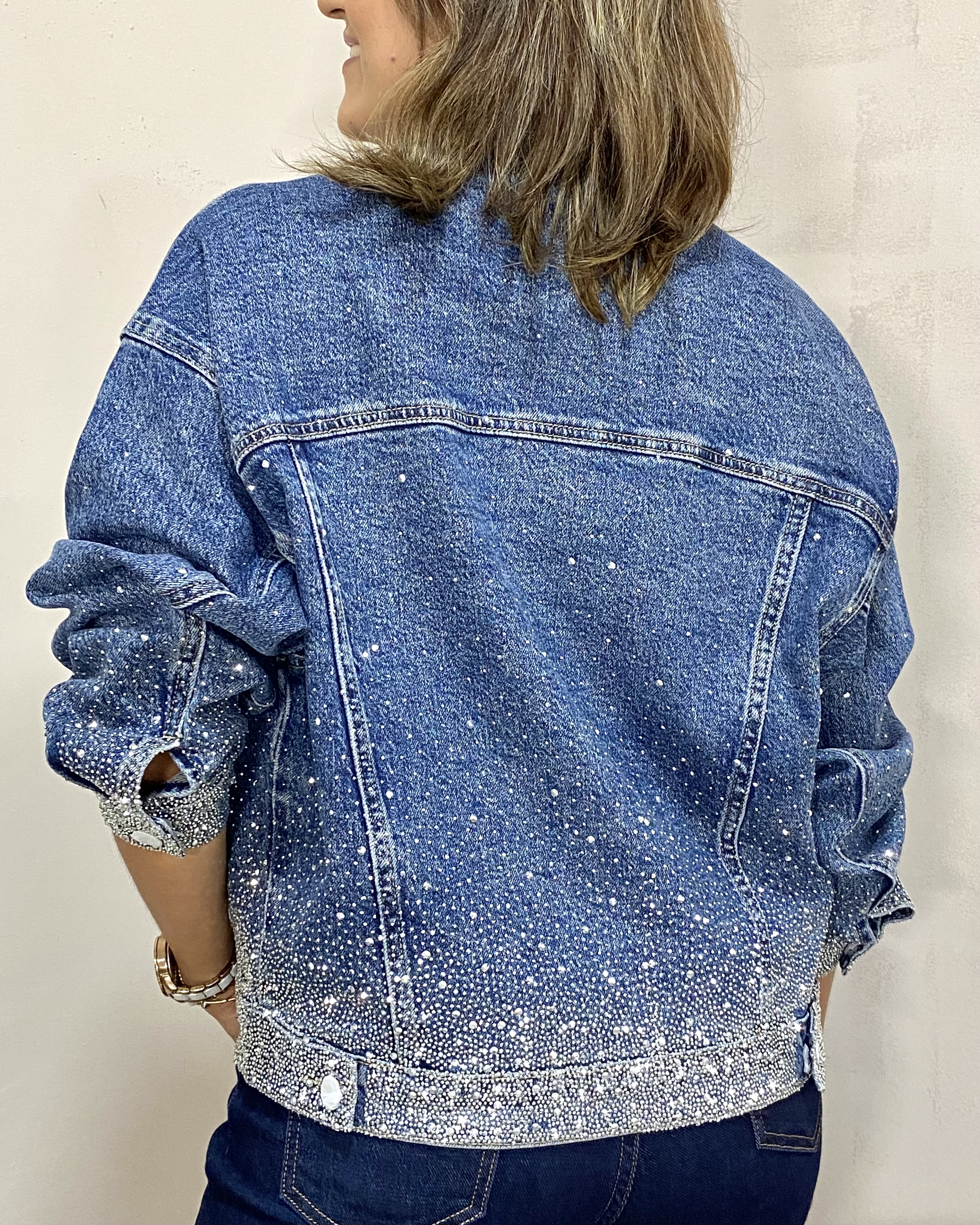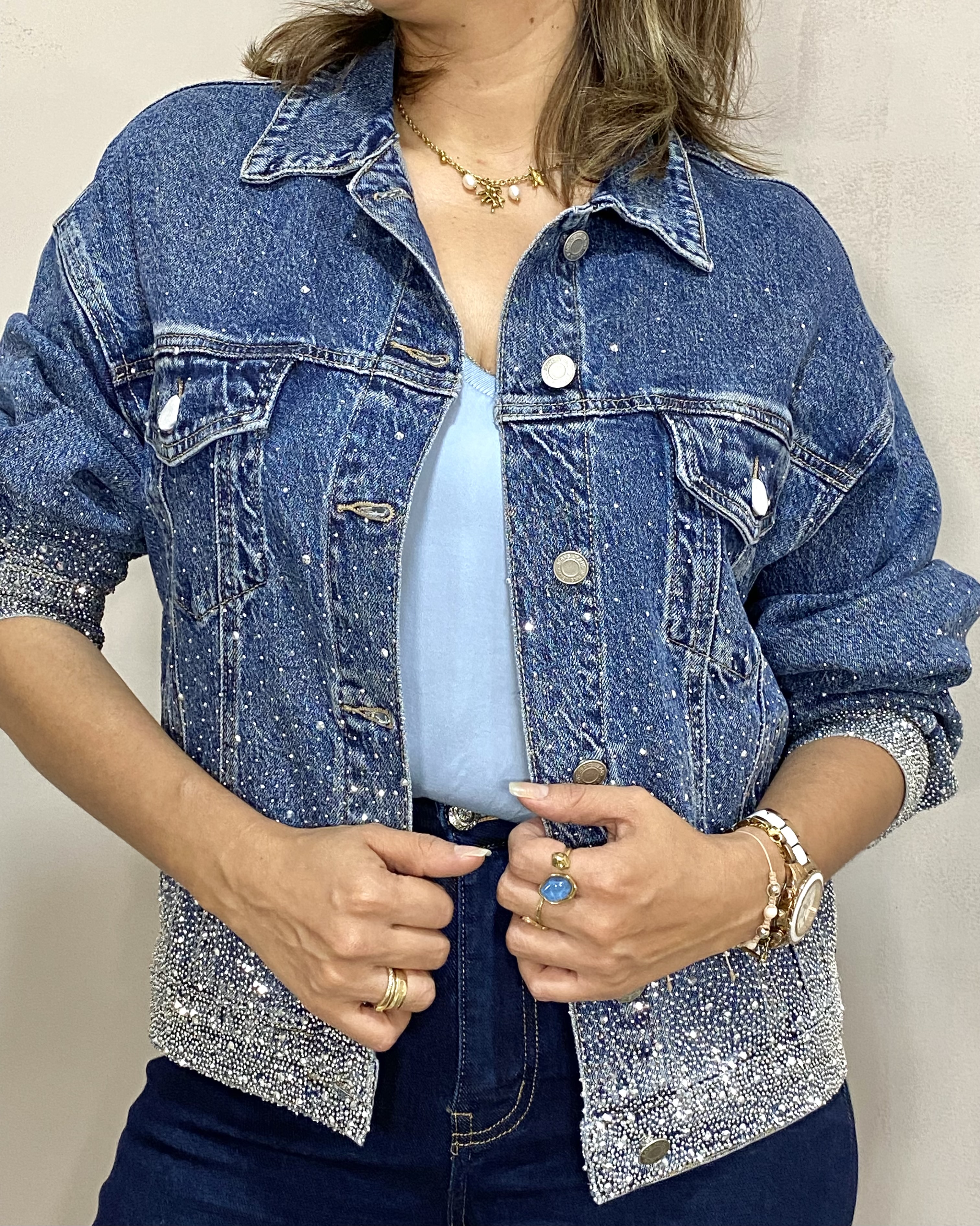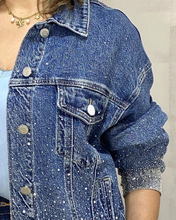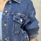 Chaqueta denim azul con apliques de brillo, estilo moderno y sofisticado.