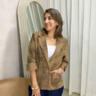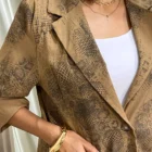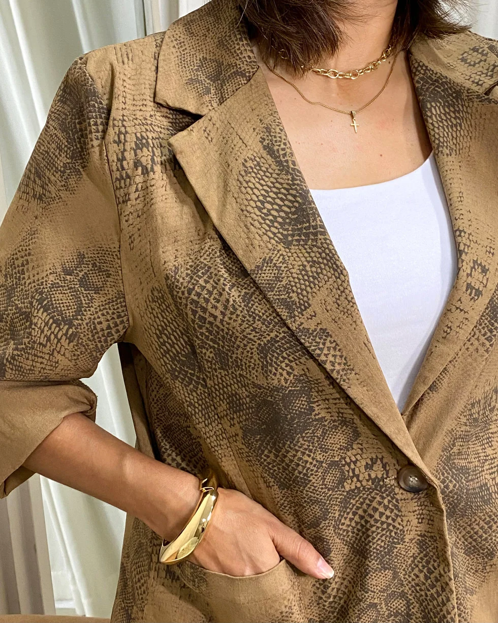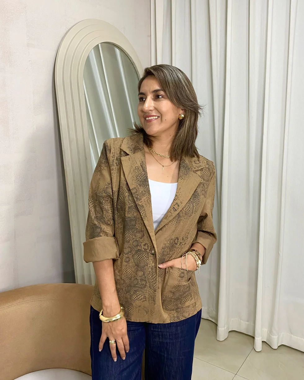 Este es un blazer para mujer en tono camel con estampado snakeprint. Diseñado con solapa clásica, cierre de botón y bolsillos frontales funcionales. Sus mangas pueden usarse largas o dobladas para un aire más casual, mientras que el corte recto estiliza la figura. Es perfecto para combinar con jeans, pantalones de vestir o faldas y crear el outfit perfecto tanto para oficina como salidas informales.