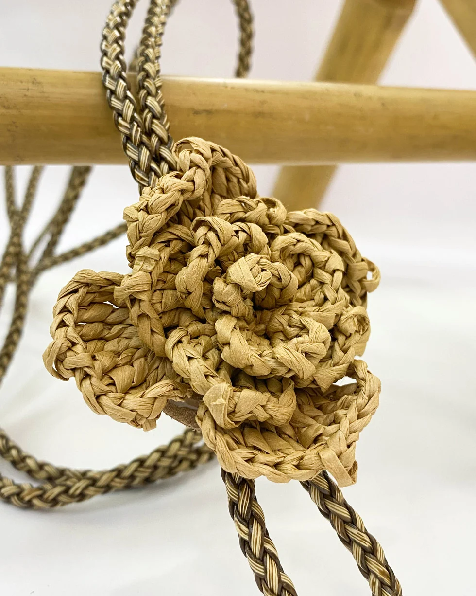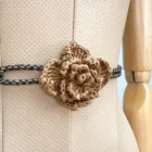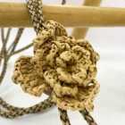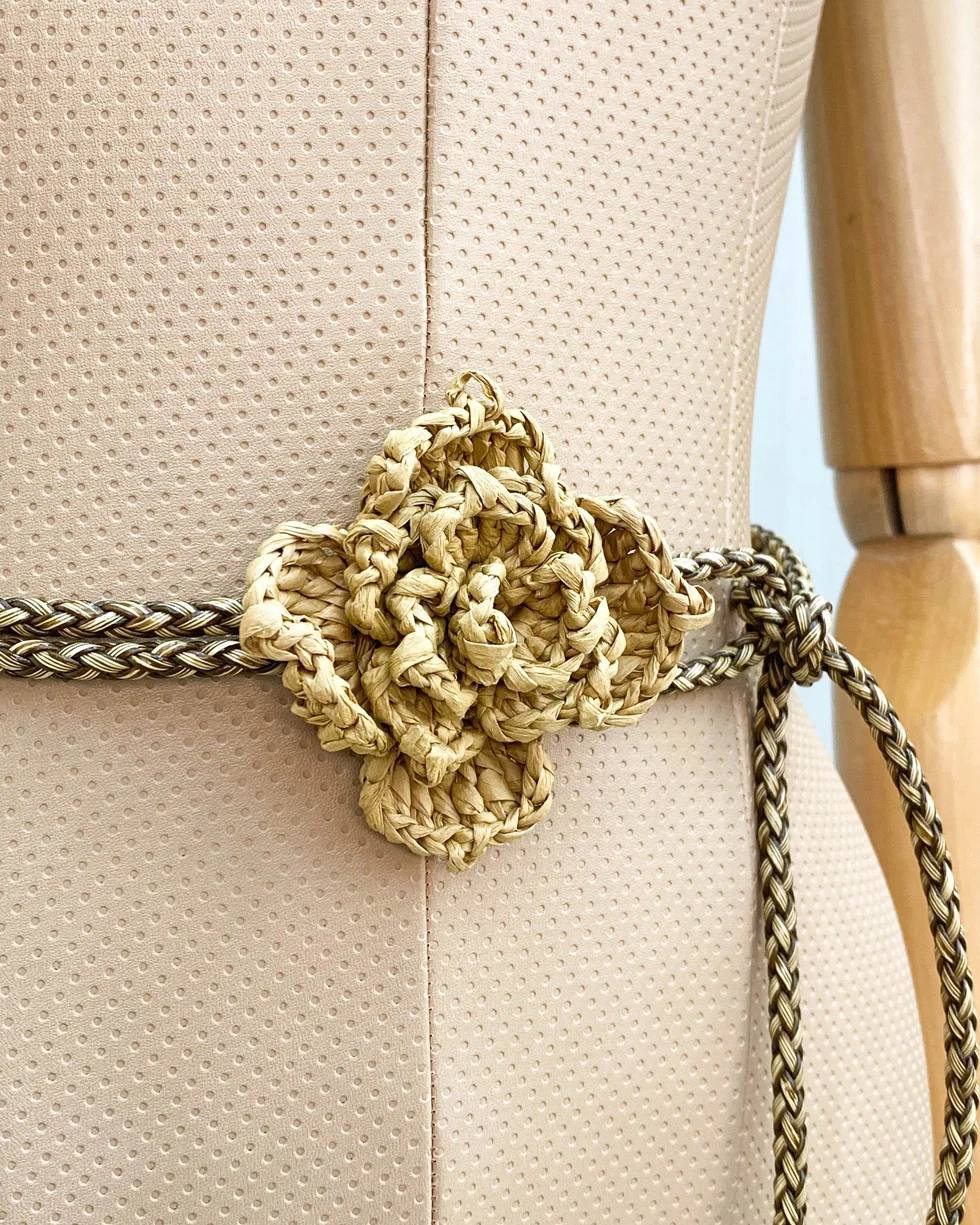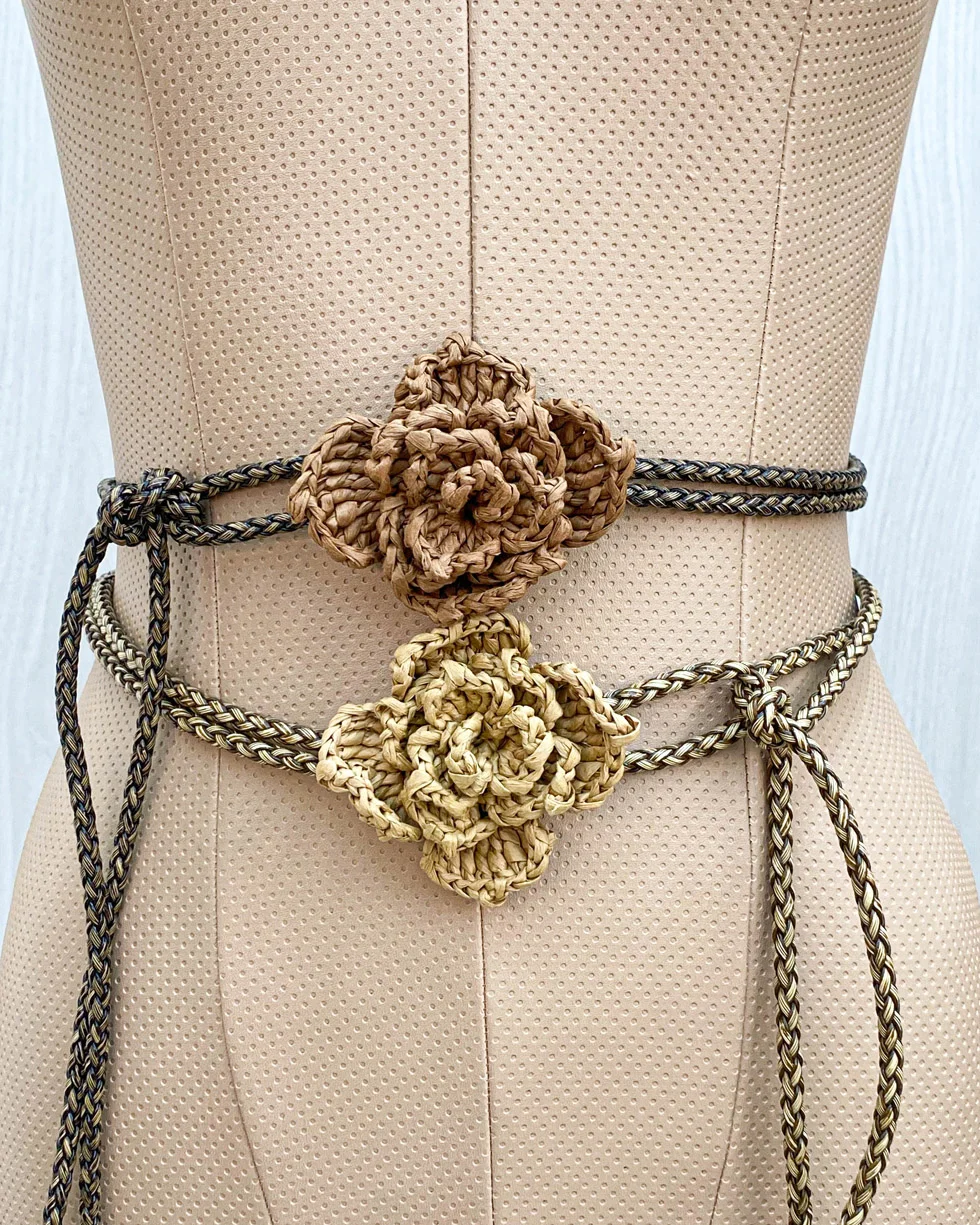 Cinturón artesanal con flor tejida y cordón trenzado ajustable. Un accesorio boho-chic, delicado y versátil.