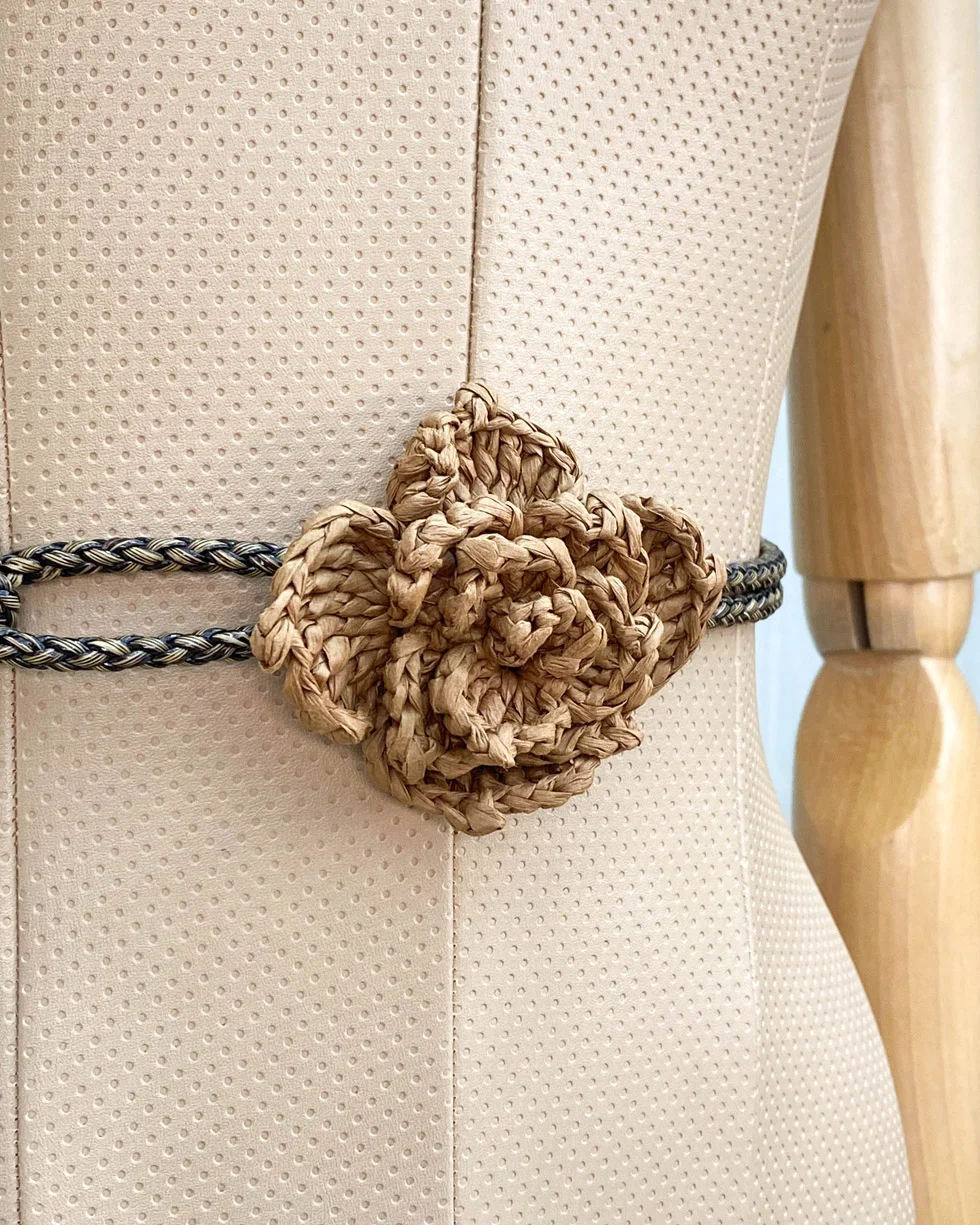 Su diseño tipo cordón trenzado ajustable convierte este cinturón en una opción versátil que se adapta a distintas tallas y estilos, permitiendo usarlo tanto a la cintura como a la cadera. La flor central tejida a mano le aporta un aire boho y romántico, ideal para complementar vestidos vaporosos, blusas oversize o conjuntos de lino.