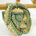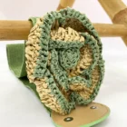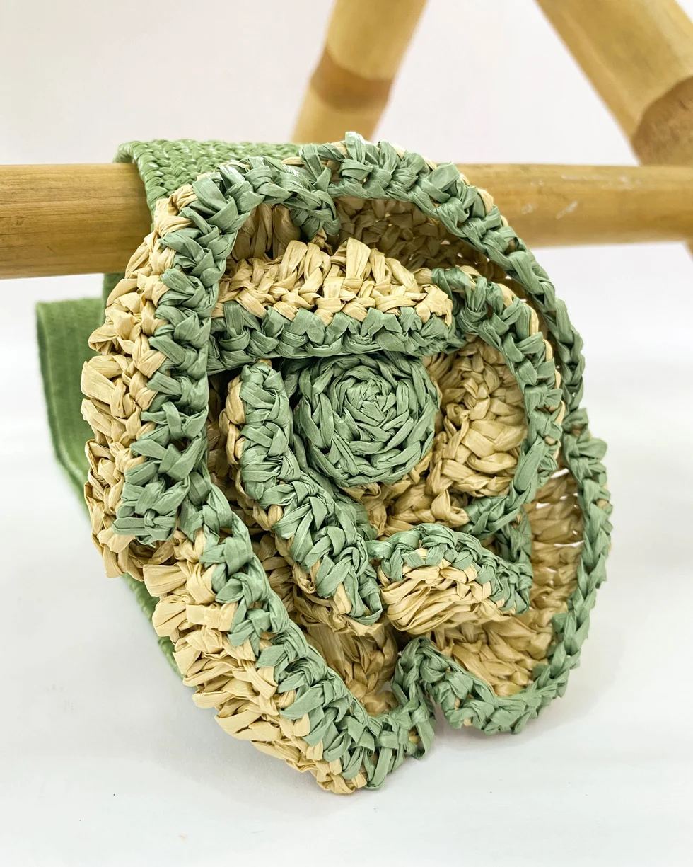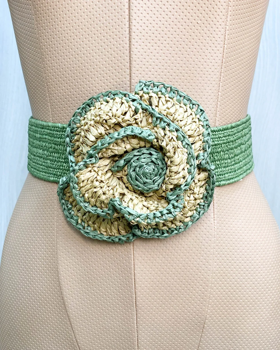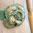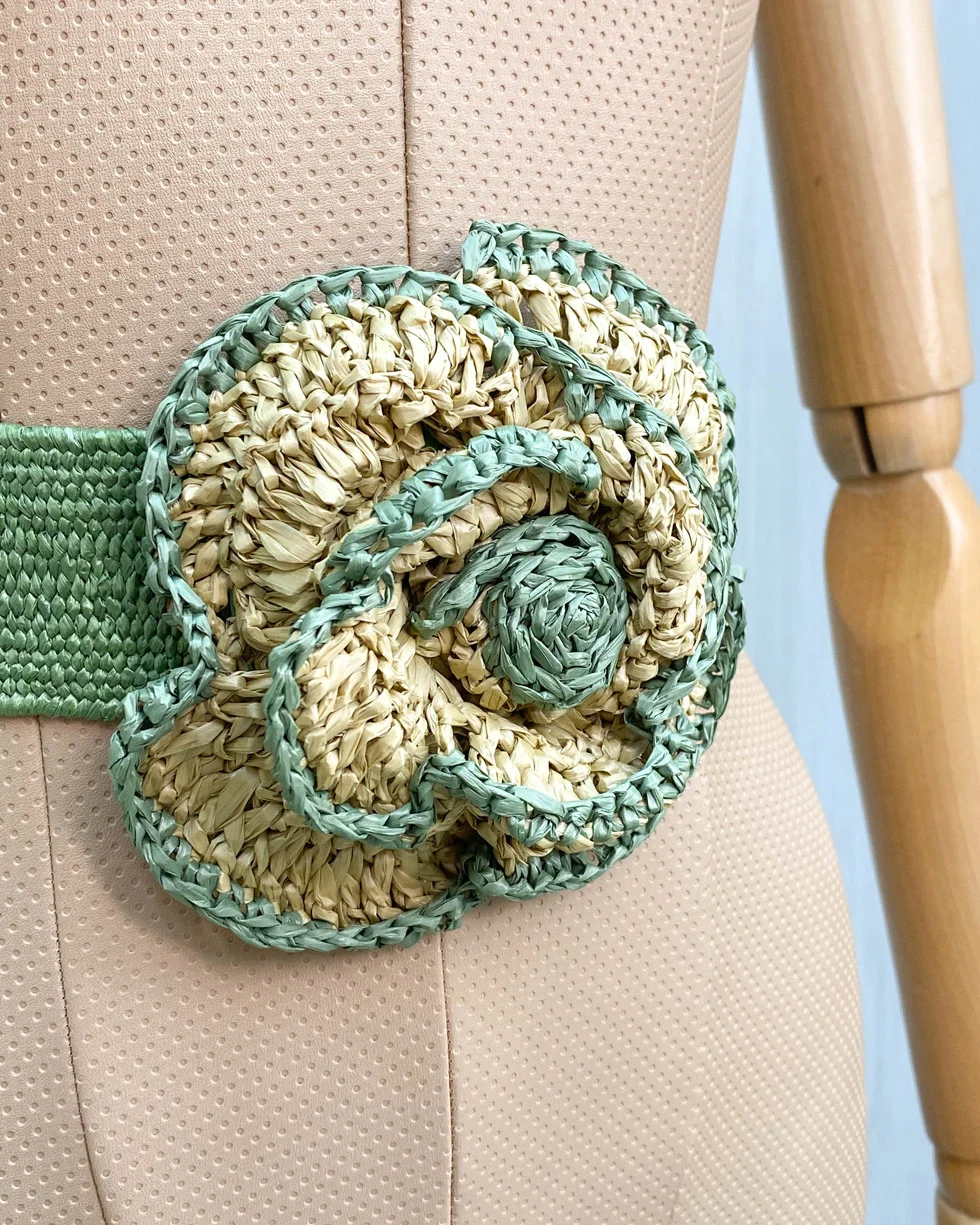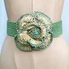 Cinturón artesanal con gran flor tejida en fibras naturales verde y beige.