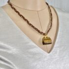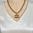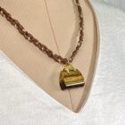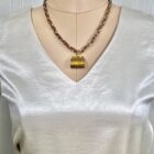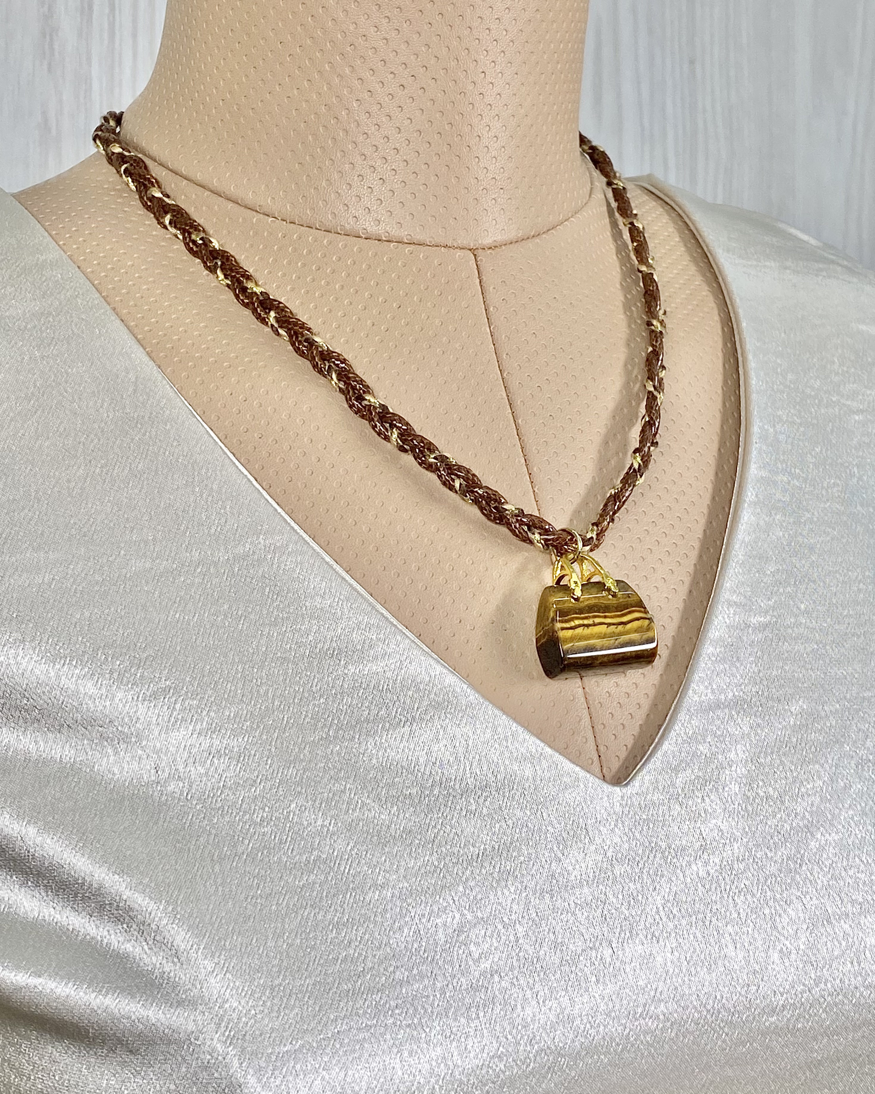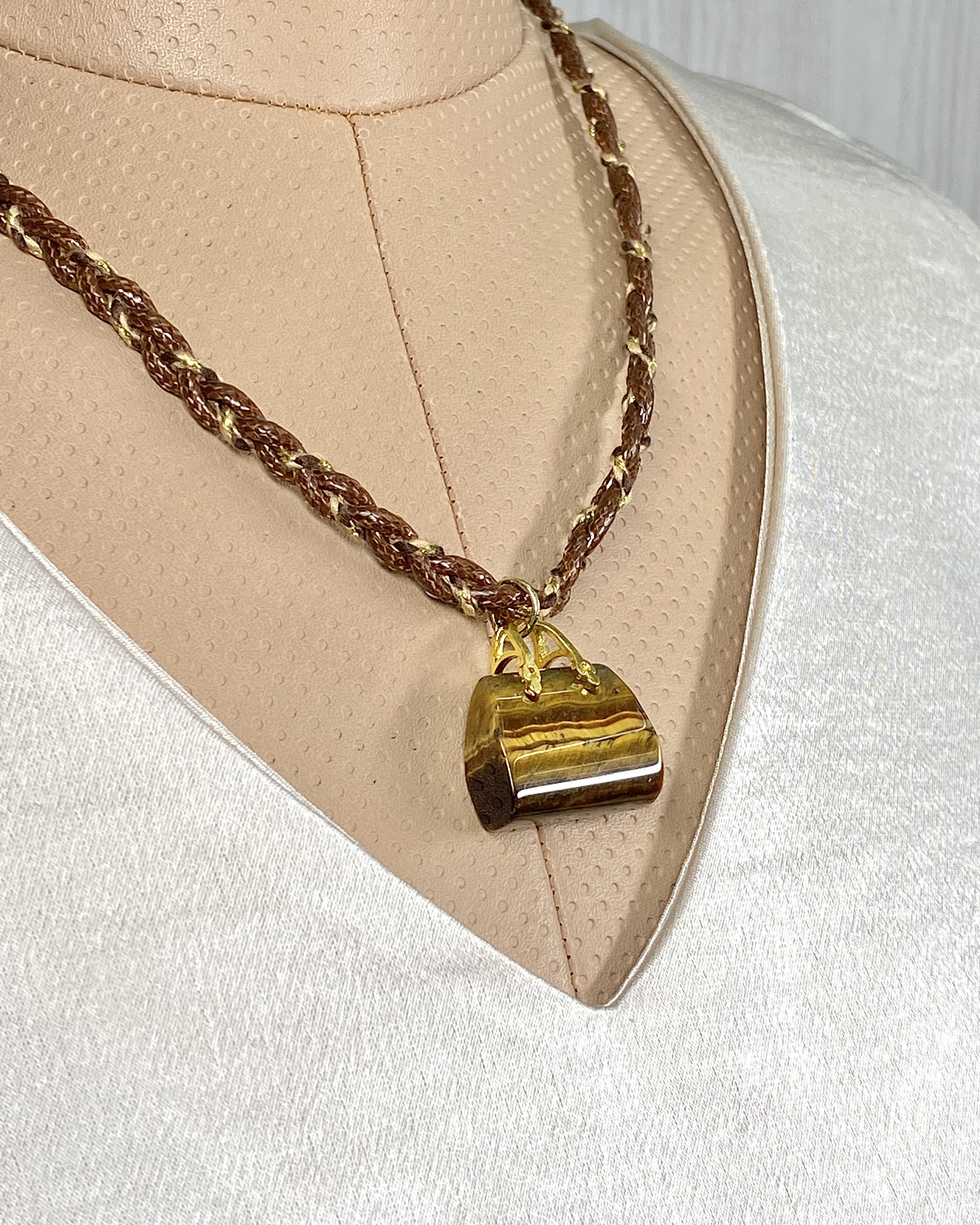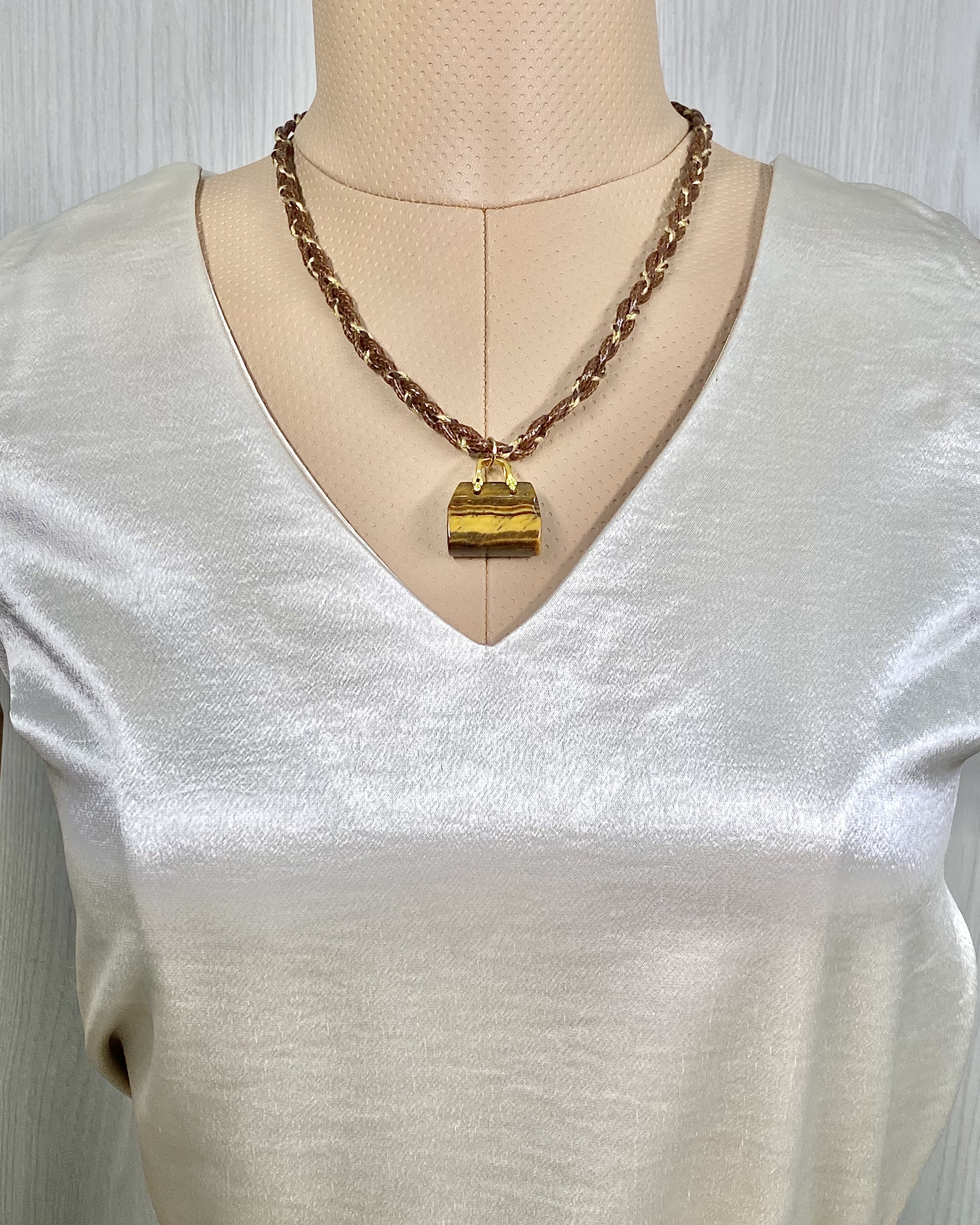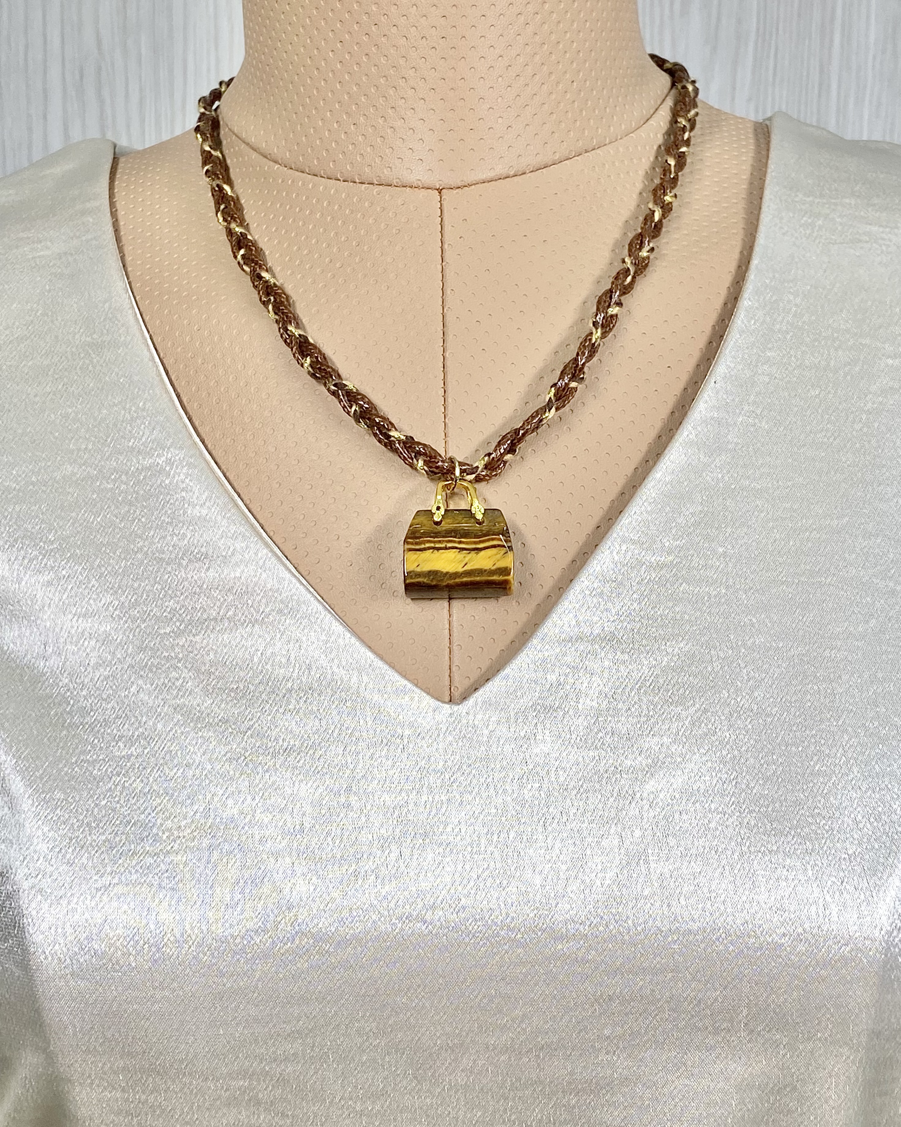 Collar con dije de piedra natural en forma de cartera en tonos dorados y marrones.