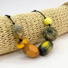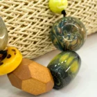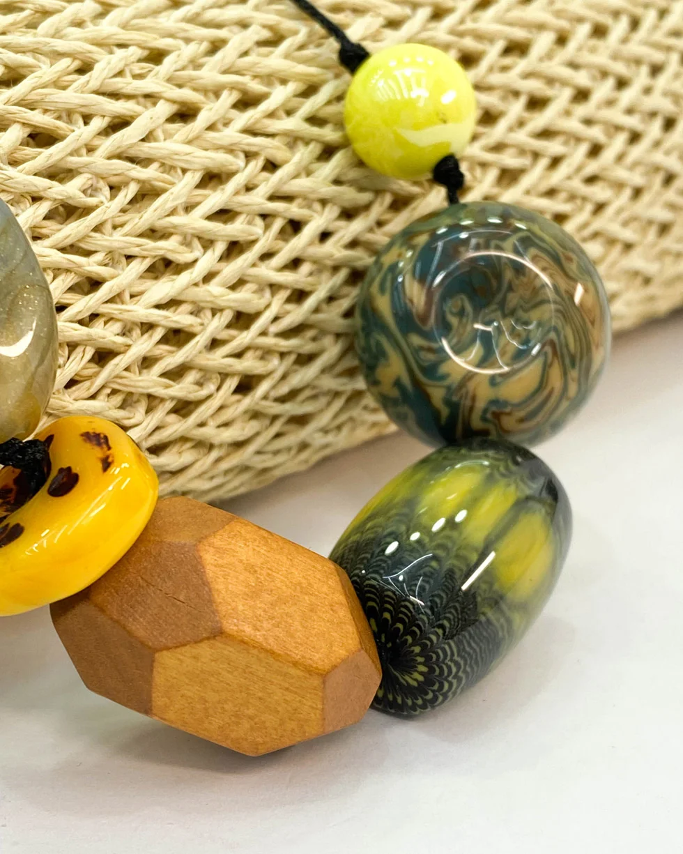 Collar artesanal con cuentas grandes de resina, madera y tonos vibrantes en amarillo, verde y marrón.