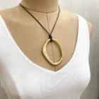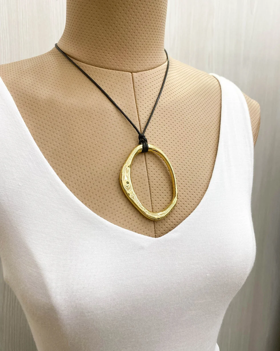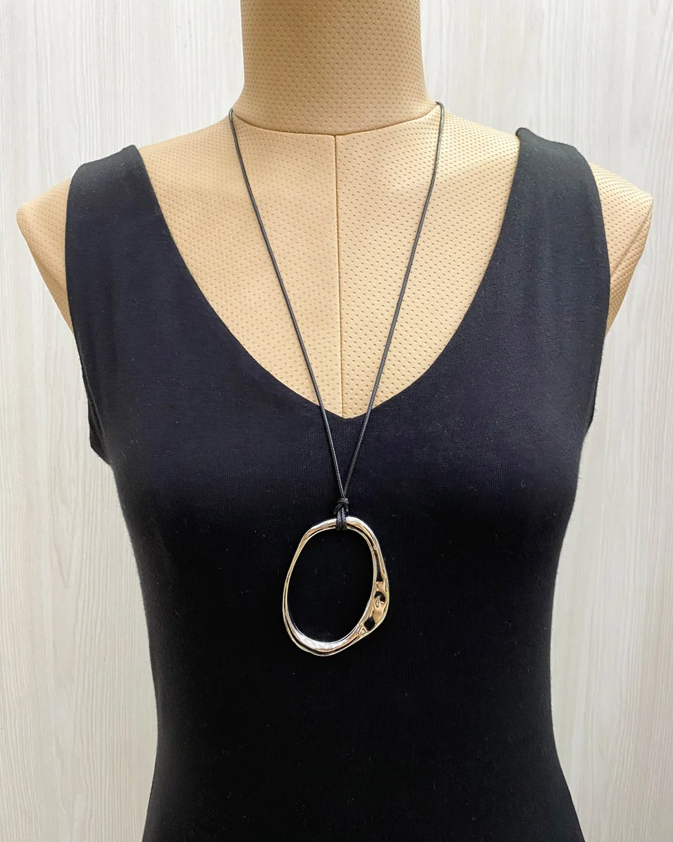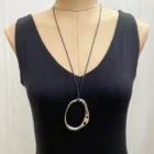 Collar largo con dije metálico en forma orgánica, moderno, versátil y minimalista.