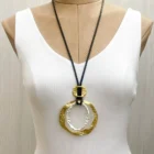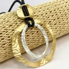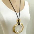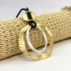 Collar artesanal con colgante circular bicolor en dorado y plateado, diseño martillado moderno y elegante, ajustable con cordón negro.