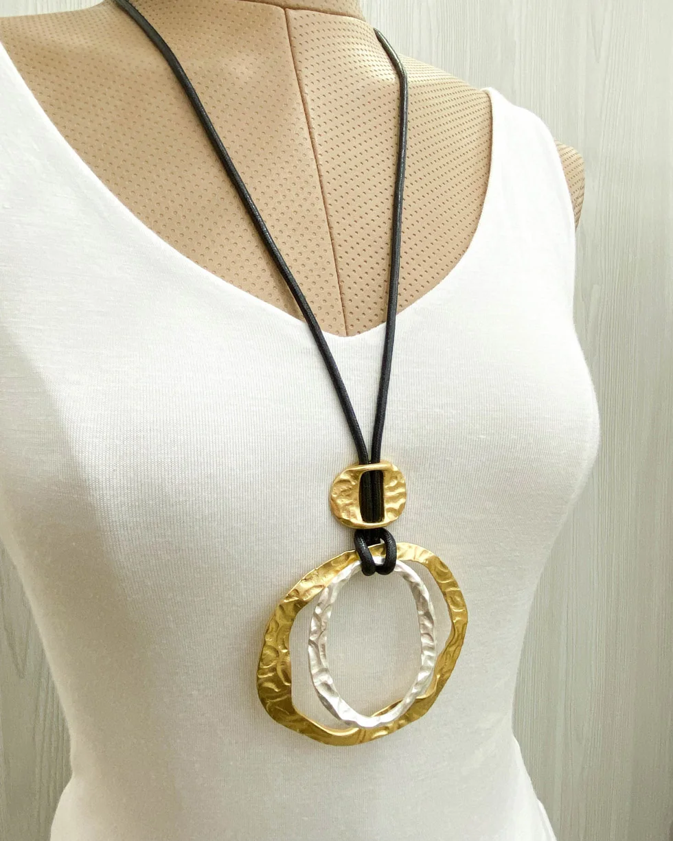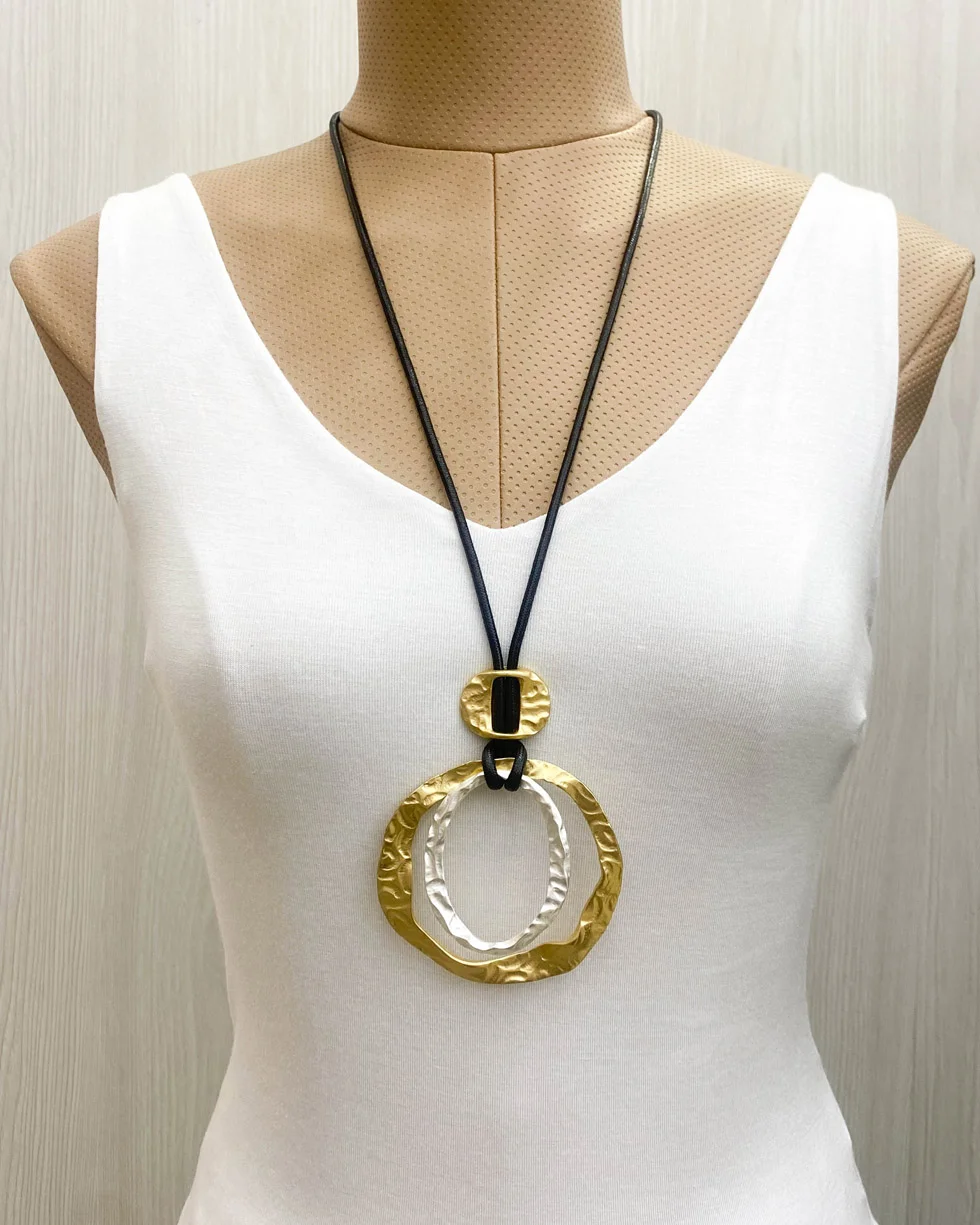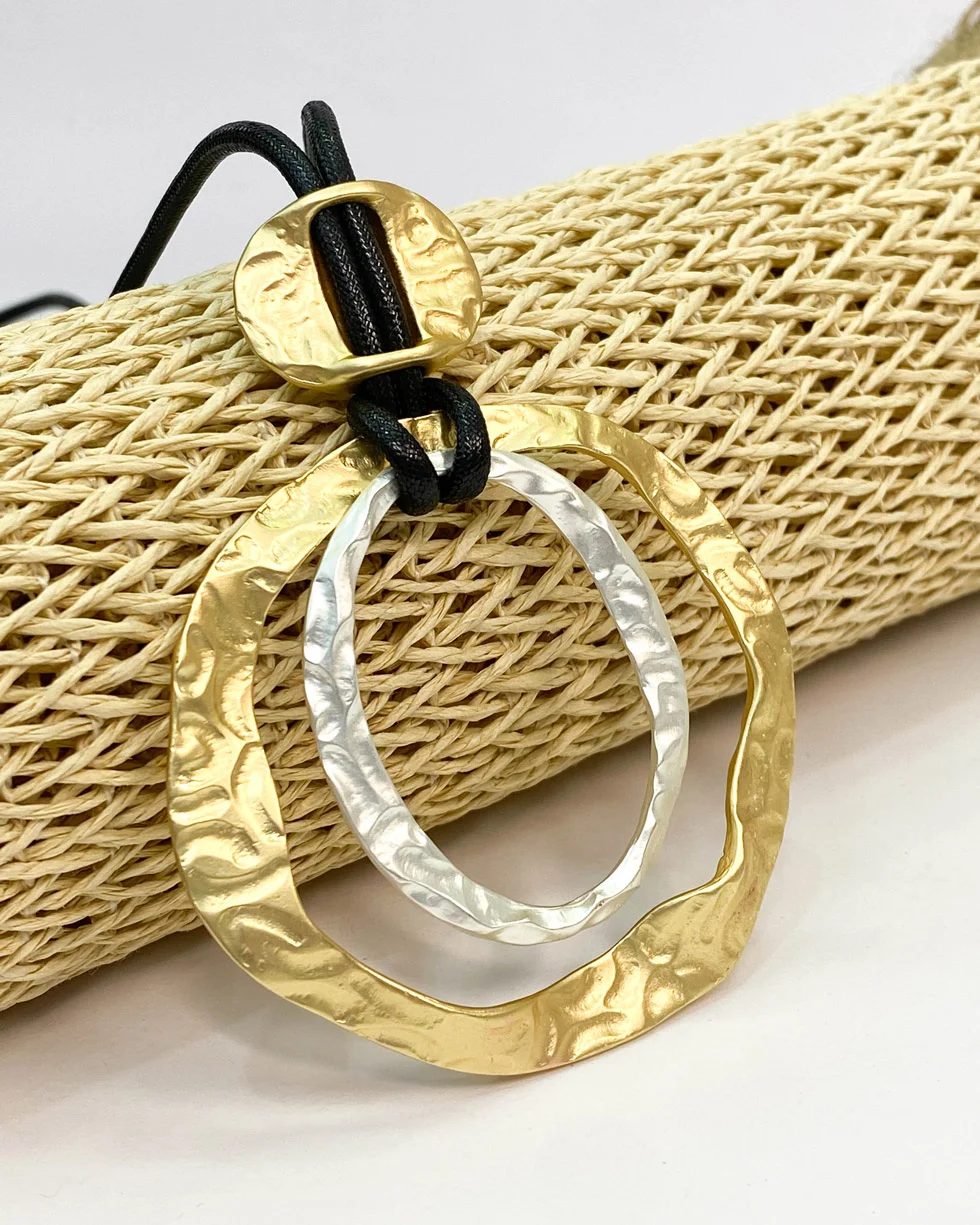 El colgante presenta dos aros de metal martillado con acabado irregular. Esta pieza está montada sobre un resistente cordón negro ajustable, lo que permite adaptarlo fácilmente a diferentes largos y estilos. Este es un collar artesanal que combina modernidad y estilo gracias a su diseño bicolor en dorado y plateado.