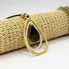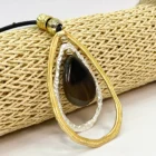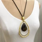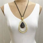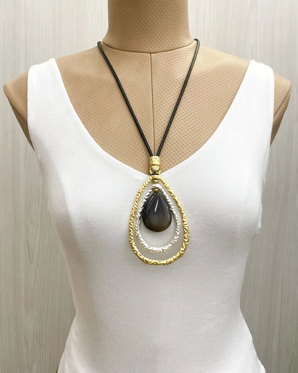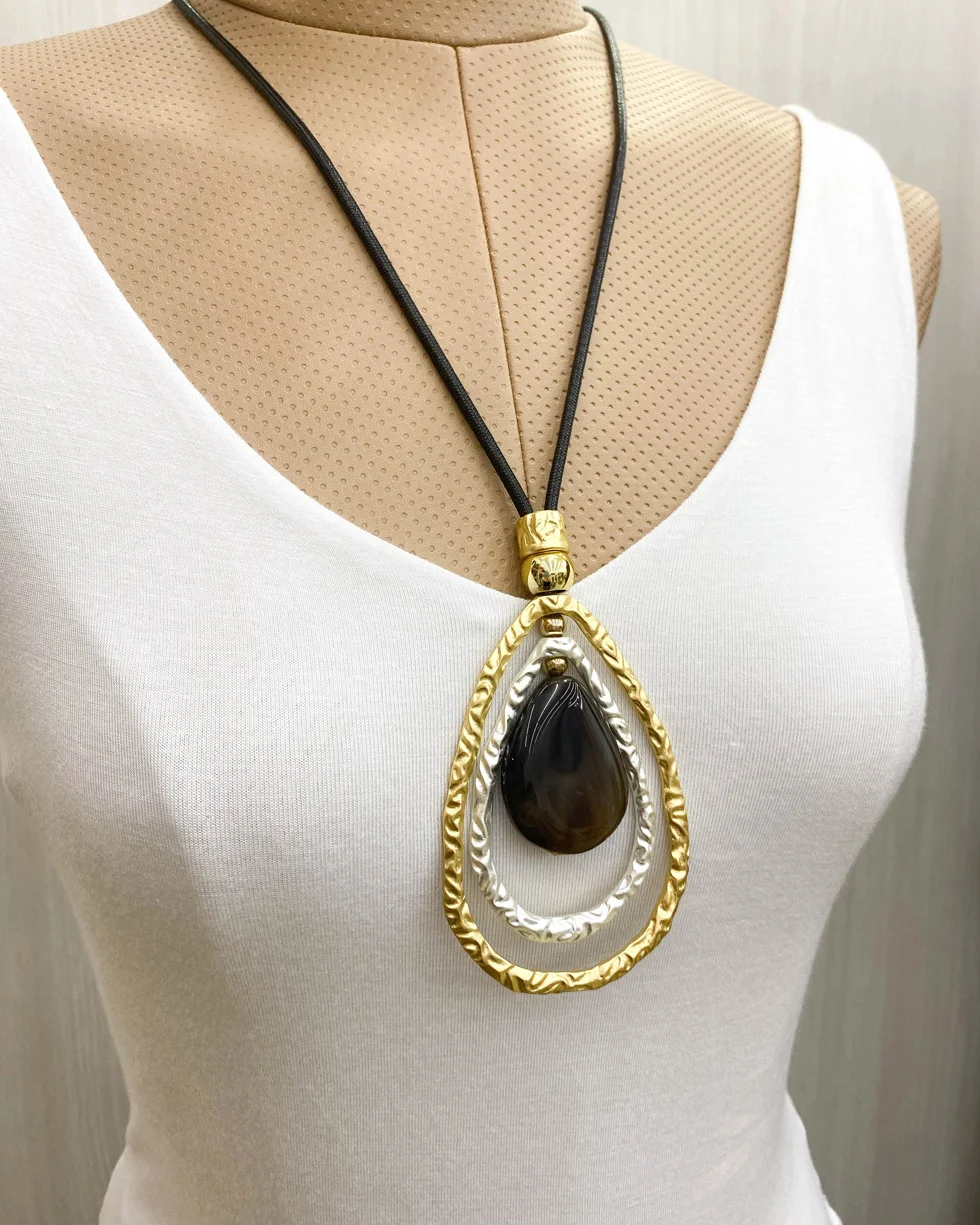 Collar con colgante grande en forma de lágrima, detalles dorados y plateados con piedra central.