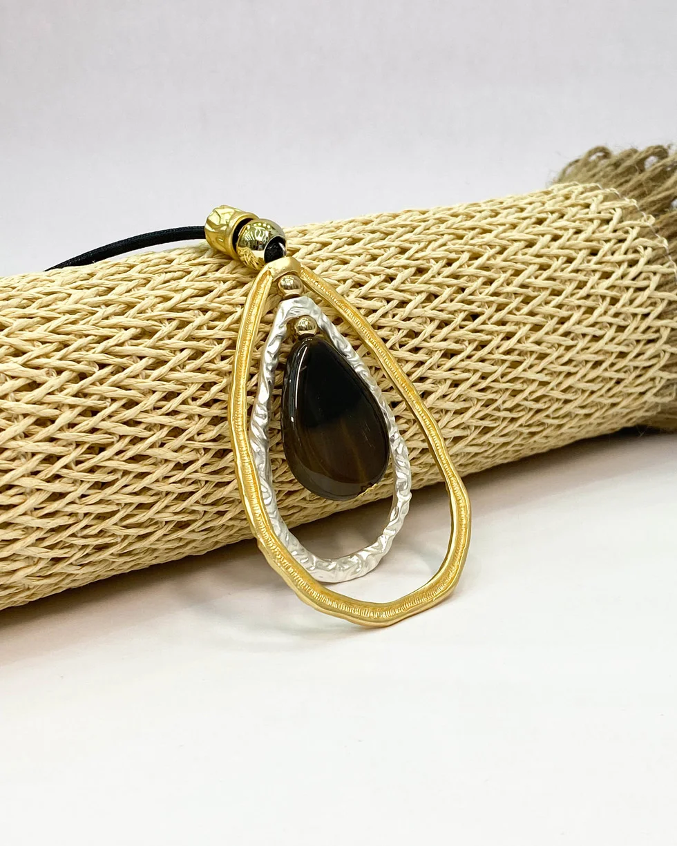 Este collar largo presenta en su diseño un doble aro texturizado en tonos dorado y plateado, que enmarcan una piedra central con acabado natural, la misma que se vuelve protagonista de tu look. Este modelo es perfecto para realzar blusas, vestidos o tops de cuello sencillo.